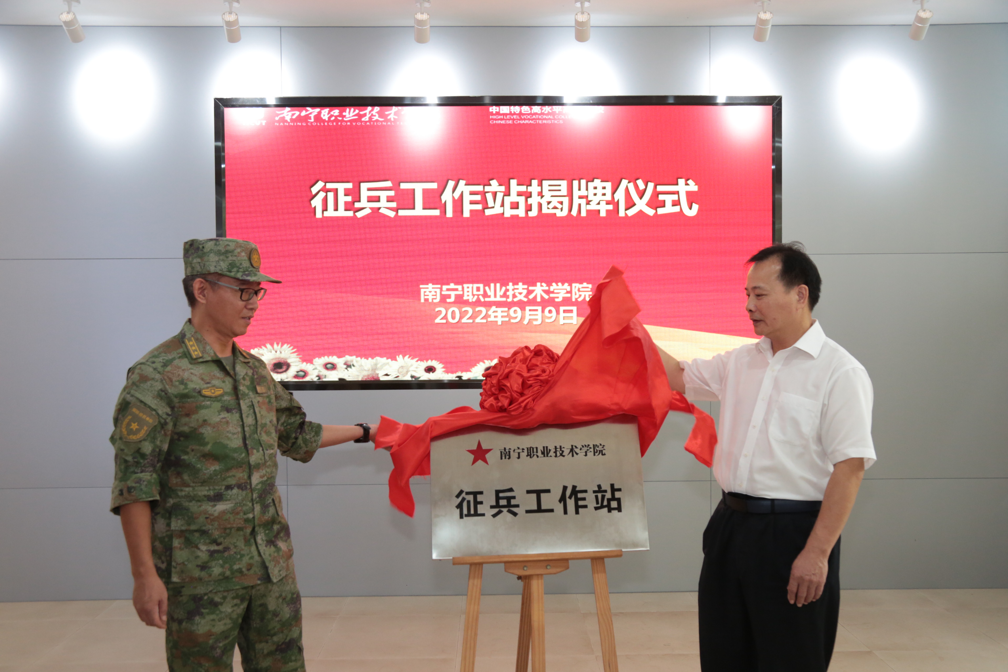 黄明瑞与阎继宏为“南宁职业技术学院征兵工作站”揭牌(南职融媒岑广路/摄)