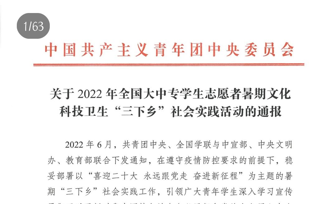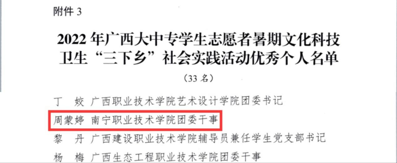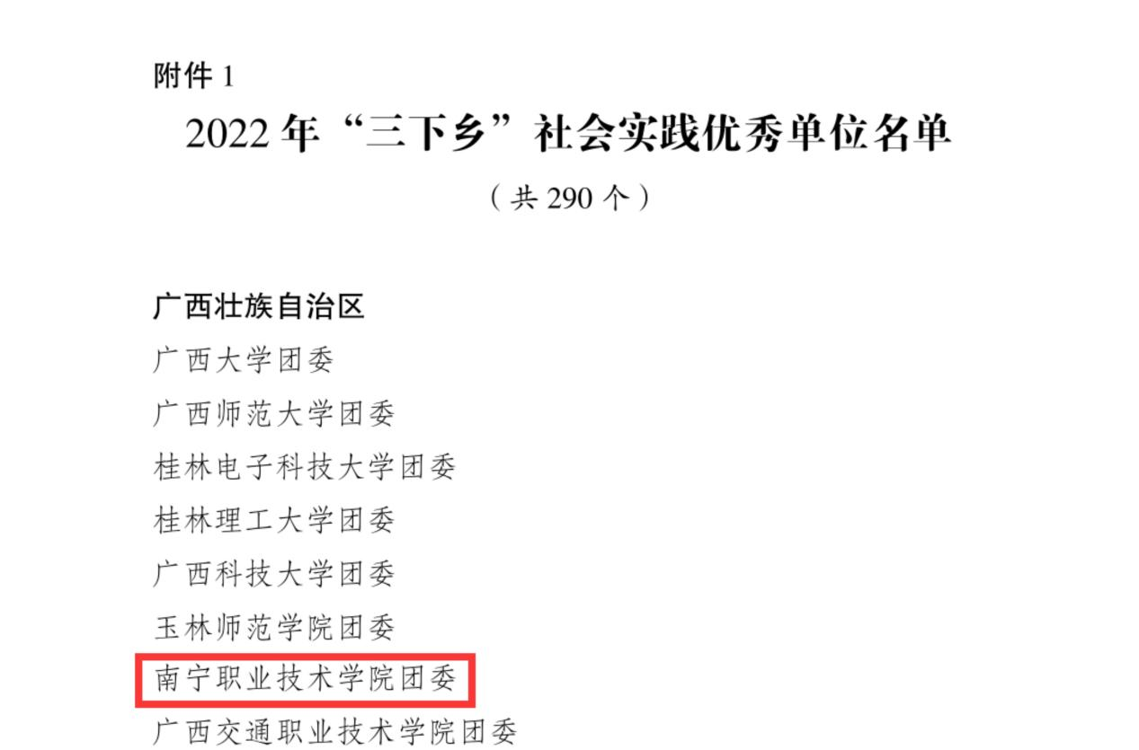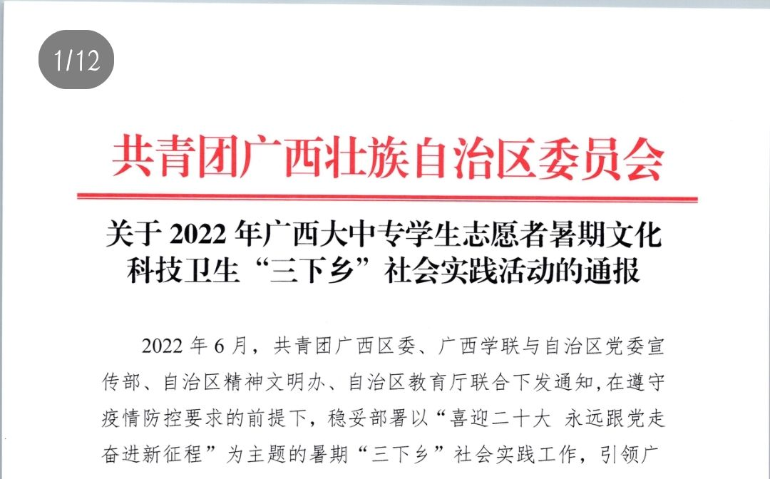 近日,中国共产主义青年团中央委员会、共青团广西壮族自治区委员会分别下发《关于2022年全国大中专学生志愿者暑期文化科技卫生“三下乡”社会实践活动的通报》、《关于2022年广西大中专学生志愿者暑期文化科技卫生“三下乡”社会实践活动的通报》,对在2022年暑期“三下乡”社会实践活动中表现优异的集体、个人和项目进行通报表彰。