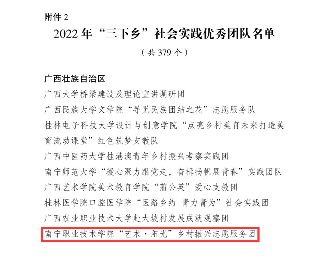 必赢官网喜获全国2022年“三下乡”社会实践优秀单位,南宁职业技术学院“艺术·阳光”乡村振兴志愿服务团喜获全国2022年“三下乡”社会实践优秀团队。