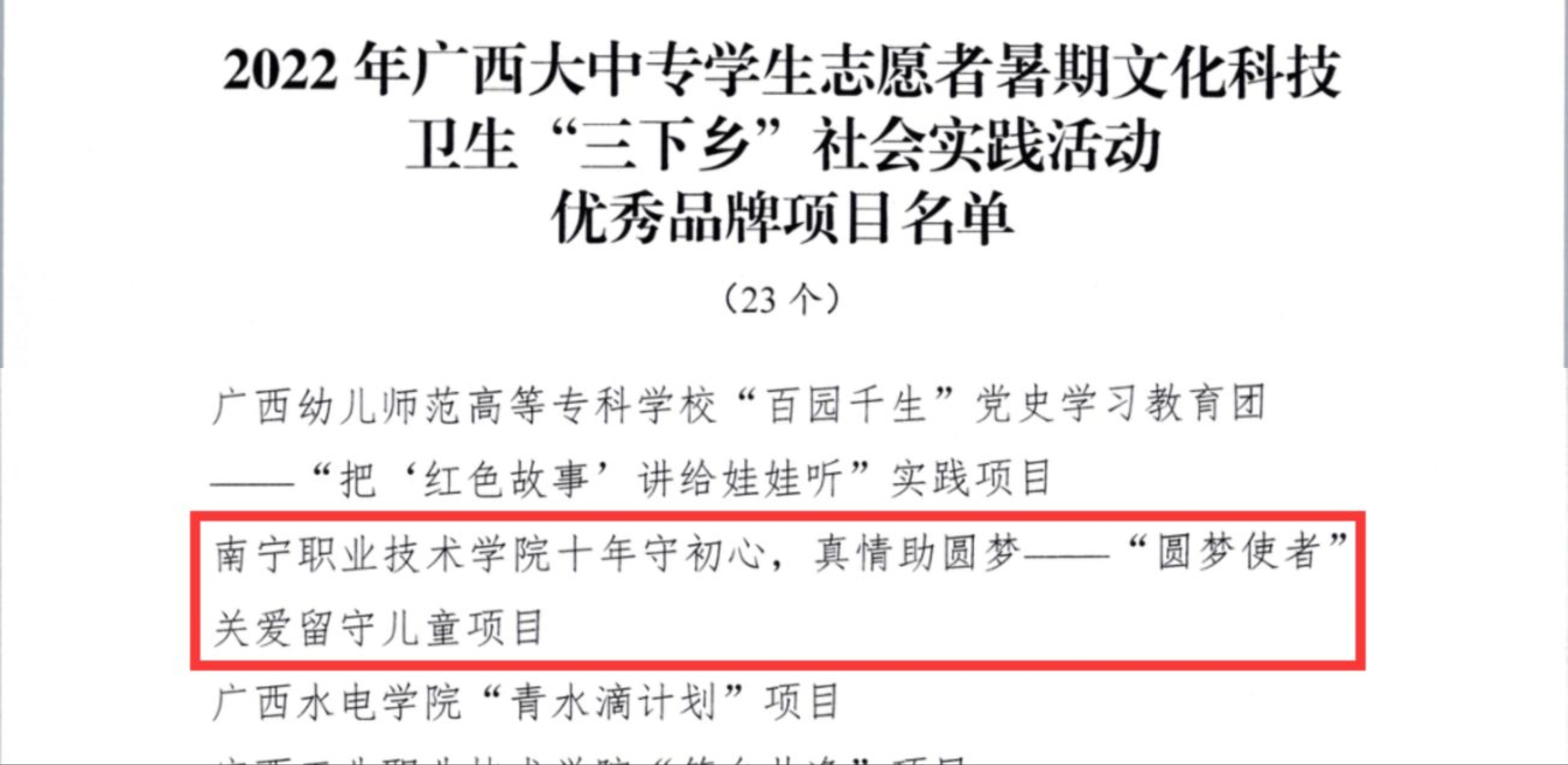 校团委周蒙婷老师荣获2022年广西大中专学生志愿者暑期文化科技卫生“三下乡”社会实践活动优秀个人,南宁职业技术学院十年守初心,真情助圆梦——“圆梦使者”关爱留守儿童项目荣获2022年广西大中专学生志愿者暑期文化科技卫生“三下乡”社会实践活动优秀品牌项目。