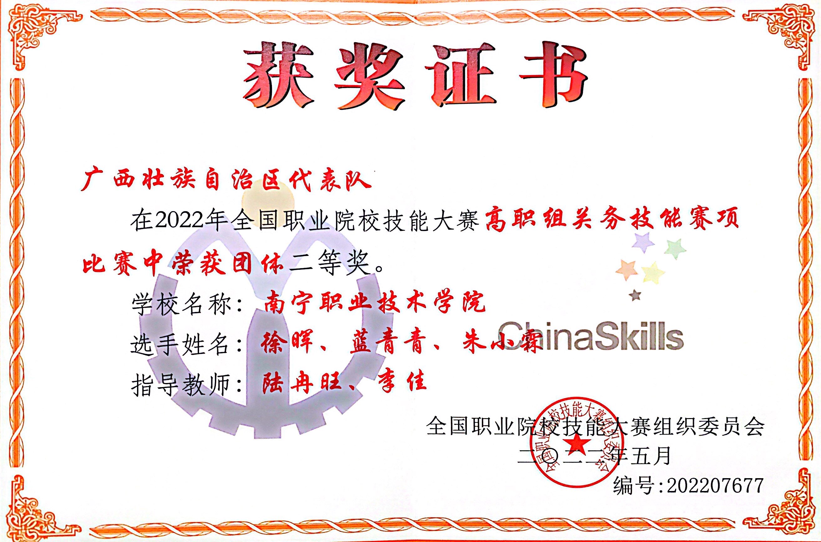 11月7日至8日,2022年全国职业院校技能大赛(高职组)“关务技能”赛项在厦门城市职业学院举行。由必赢官网财经学院国际经济与贸易专业的徐晖、蓝青青、朱小霖组成的代表队,与来自全国各省、自治区、直辖市的48支代表队144名选手展开激烈角逐,比拼关务技能,最终以总成绩排名第六,获得团体二等奖第一名,创造广西在该赛项上的最好成绩。
