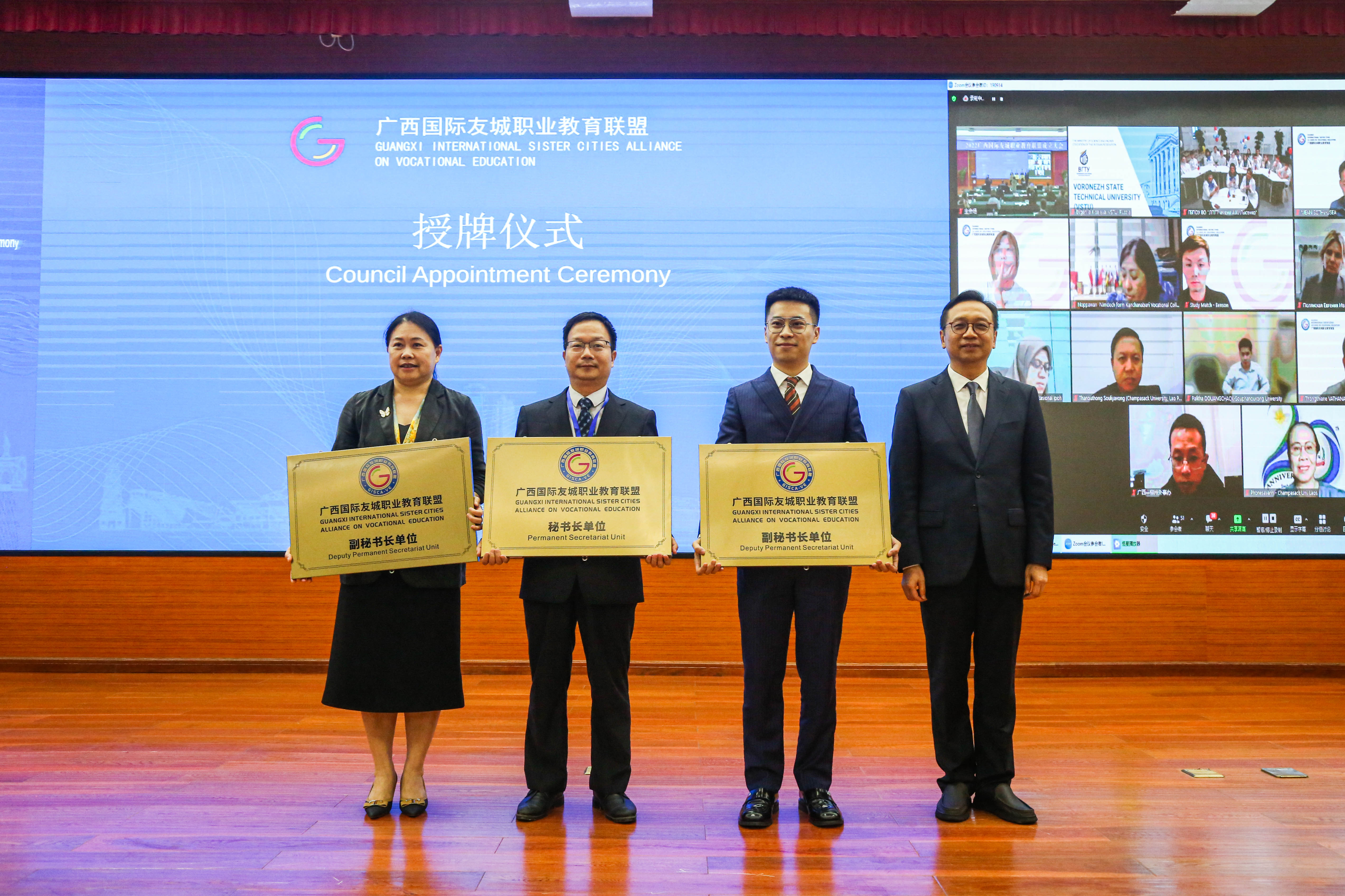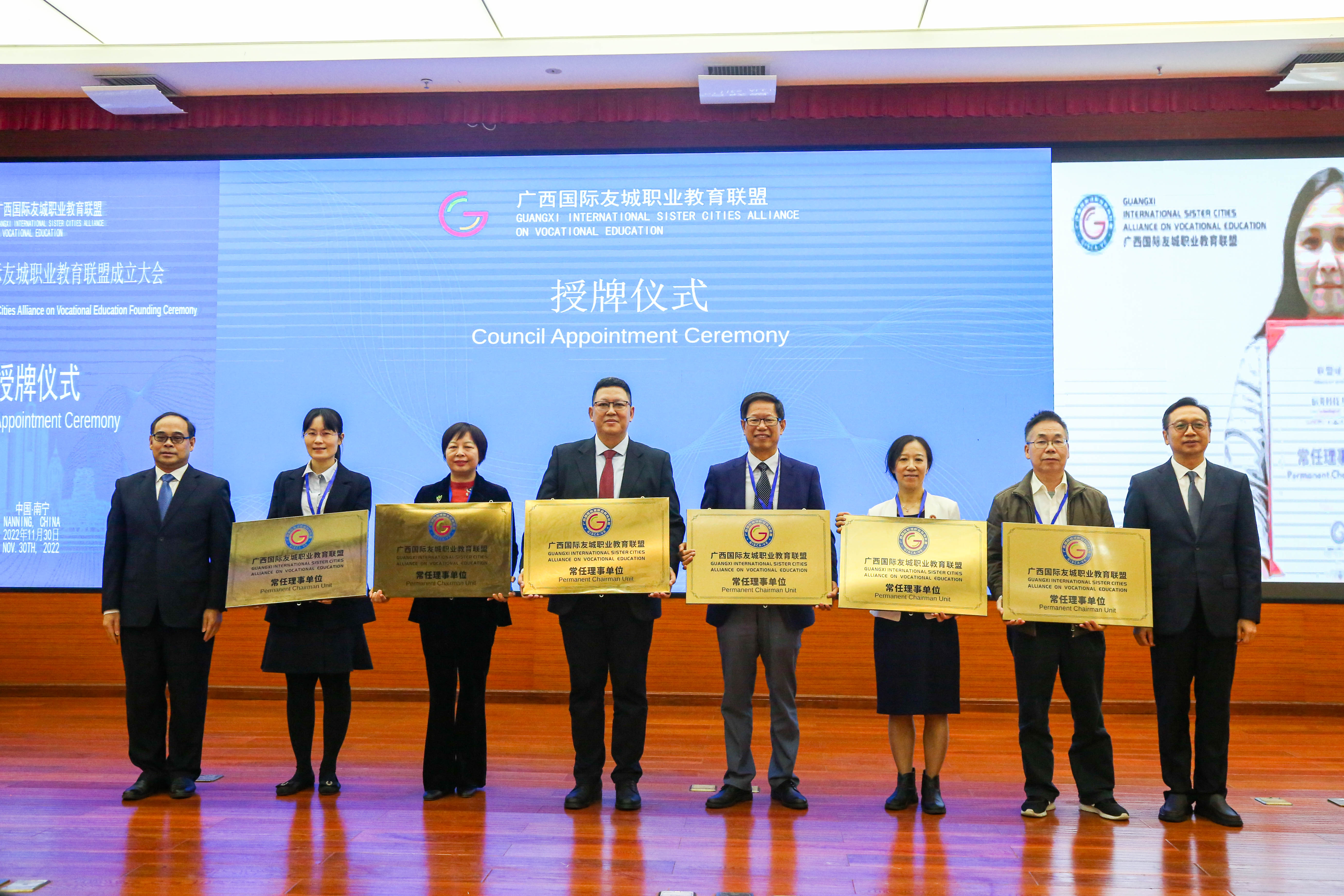 广西国际友城职业教育联盟秘书长单位、副秘书长单位被授予牌匾(南职融媒宁宇成/摄)