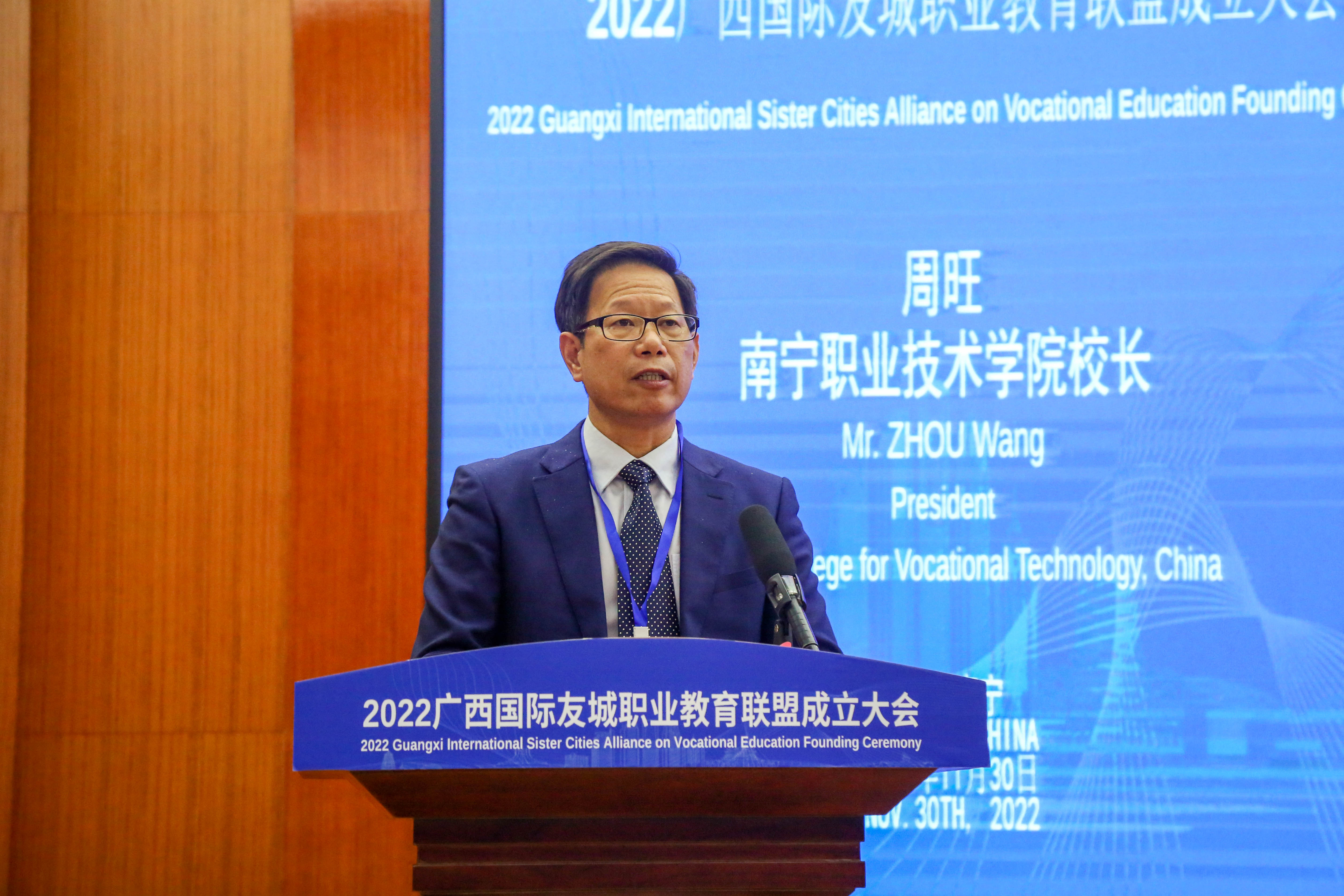 周旺在致辞中指出,广西国际友城职业教育联盟的成立,为广西和国际友城院校搭建了高层次的国际交流合作平台,创造了联盟成员间互相学习交流的机会,有利于我们拓展师生国际交流渠道,加强中外合作办学实效,提升职业教育国际化水平。作为联盟的发起单位之一及秘书长单位,南宁职业技术学院将努力为联盟成员间开展交流合作创造有利条件、提供优质服务,与各友城职业院校、教研机构、社会组织携手,精诚合作、相互扶持,共同推动职业教育和城市发展的良性循环,为城市可持续发展提供智力支持和人才支撑。