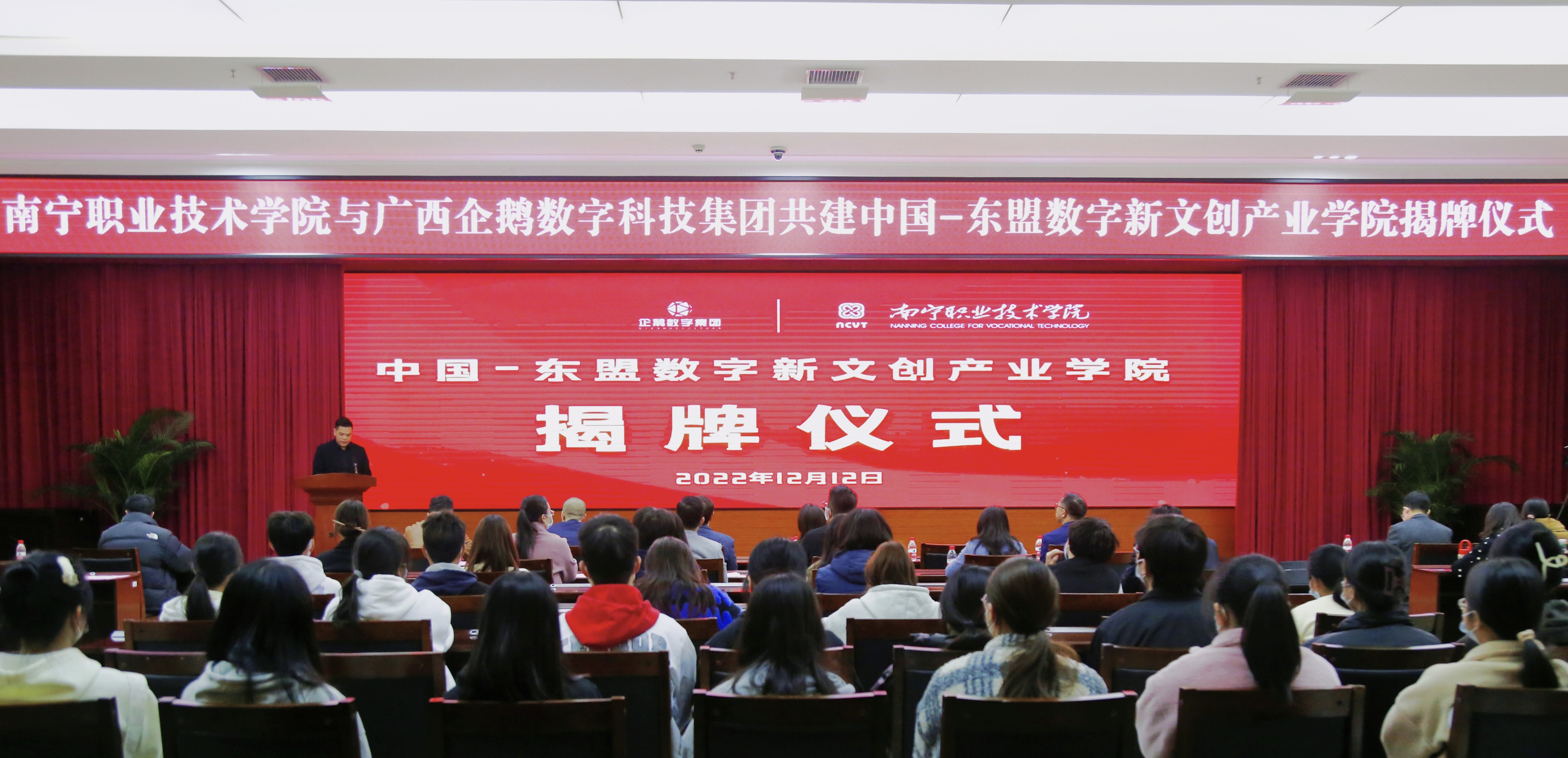 12月12日上午,由南宁职业技术学院和广西企鹅数字科技集团合作共建的“中国-东盟数字新文创产业学院”正式揭牌成立。南宁职业技术学院校长周旺,广西企鹅数字科技集团有限公司董事长何小明,广西企鹅数字科技集团有限公司执行董事兼总裁陶鸿钧等领导嘉宾以及商学院、传媒学院部分师生代表参加揭牌仪式。仪式由南宁职业技术学院商学院党委书记、院长彭敏主持。