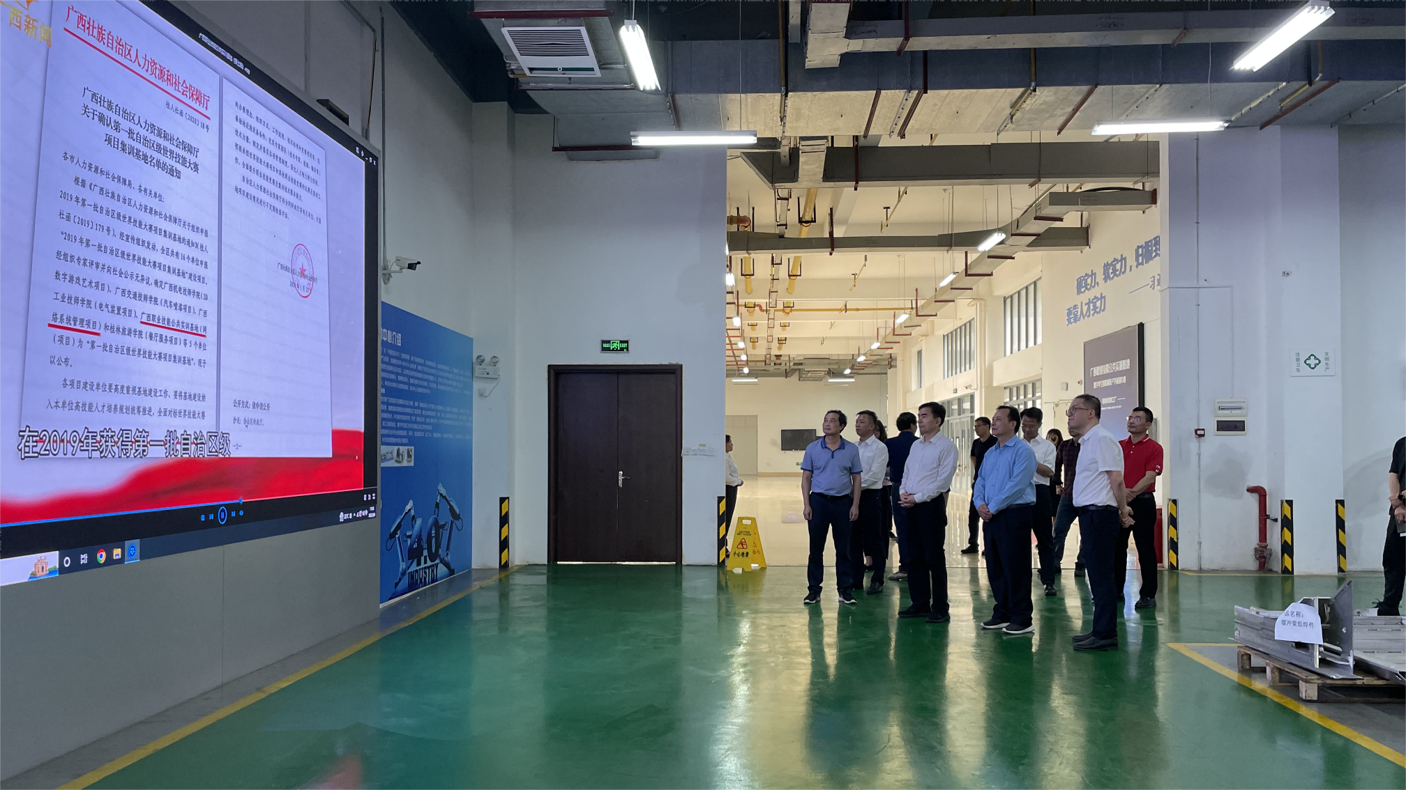 杨维超一行在观看广西职业技能公共实训基地宣传片(黄普/摄)