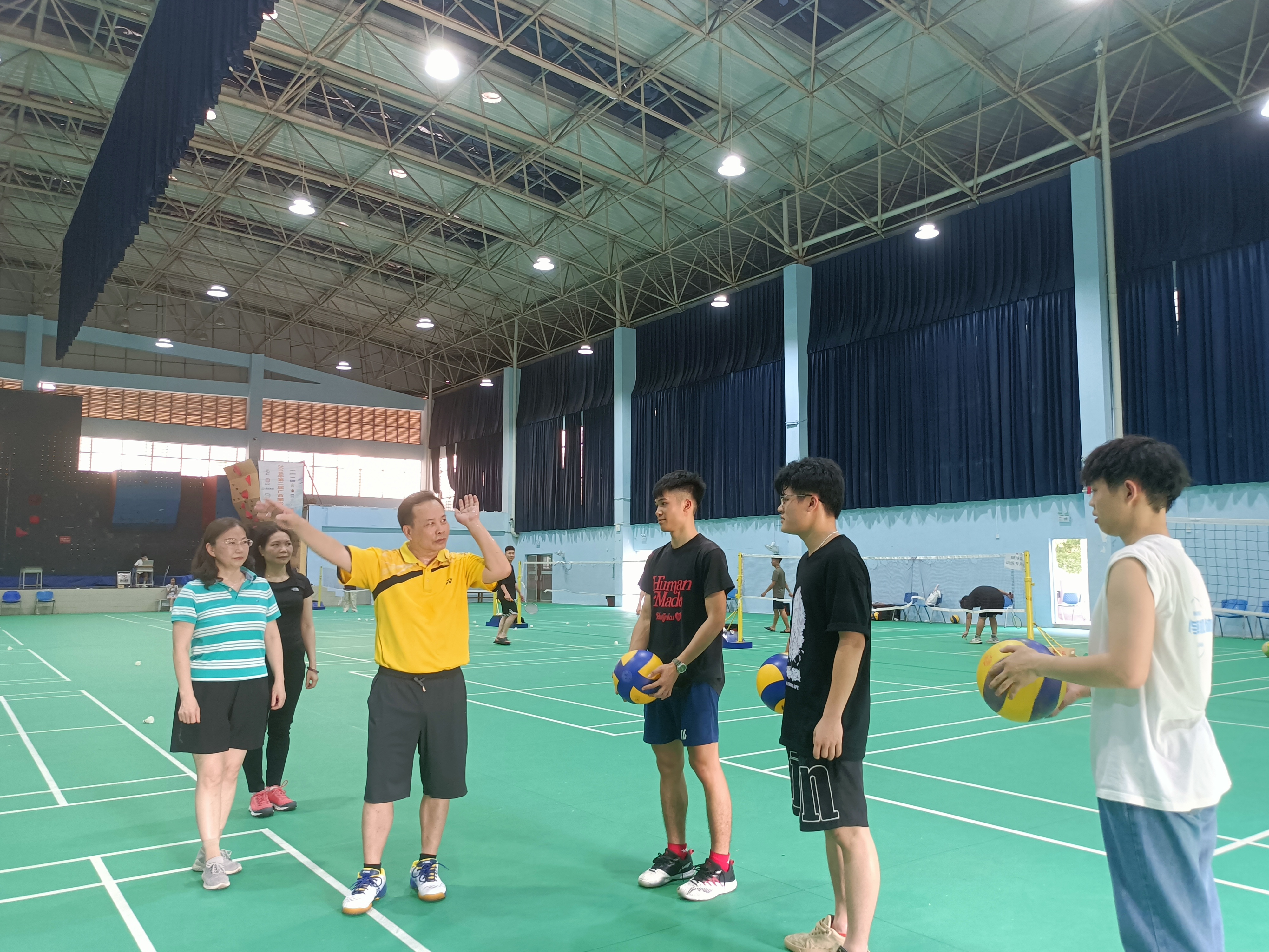 黄明瑞与同学们交流气排球发球技术(冯少卫/摄)