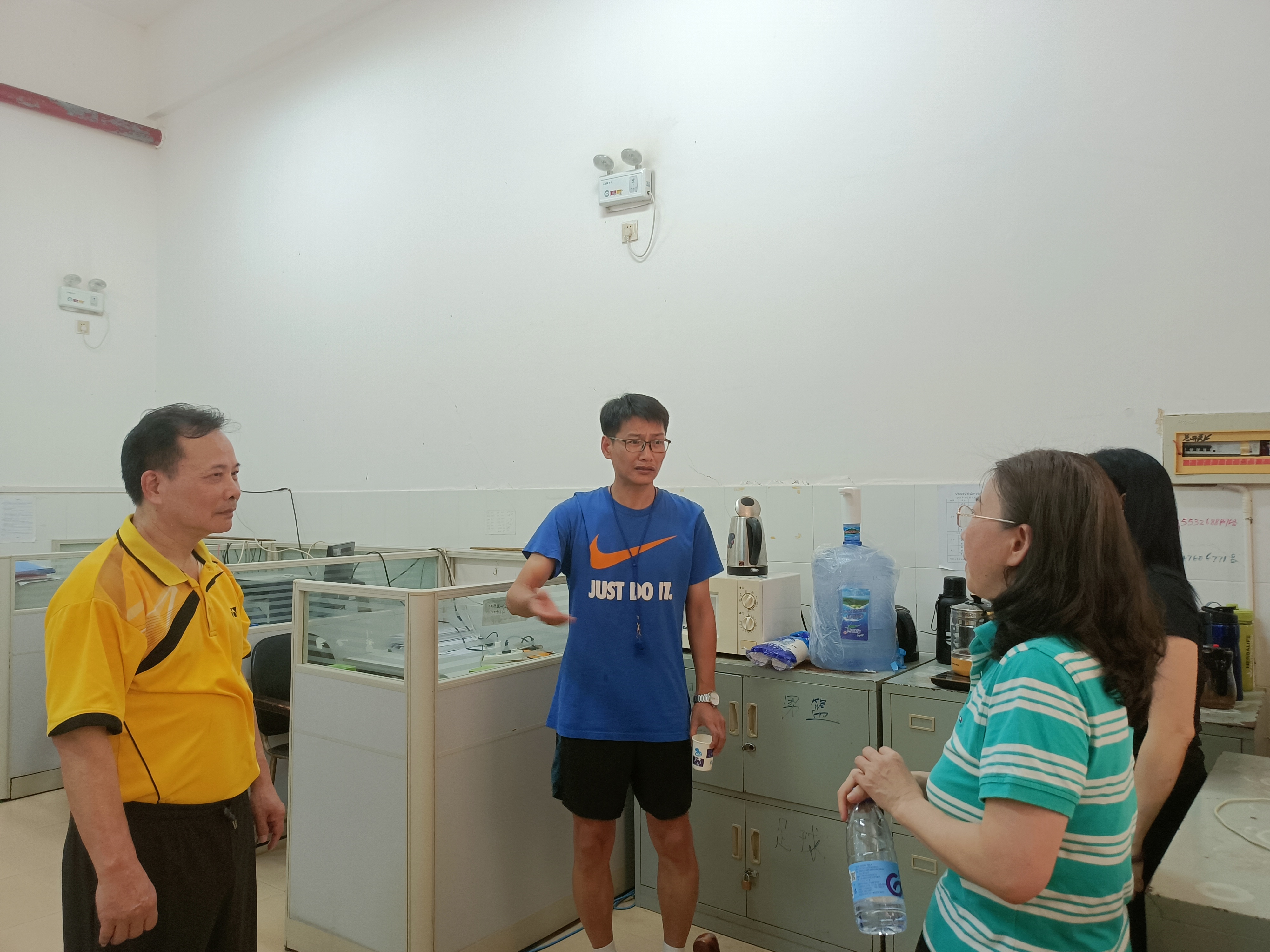 黄明瑞与体育课教师交流教学情况(高杨峡/摄)