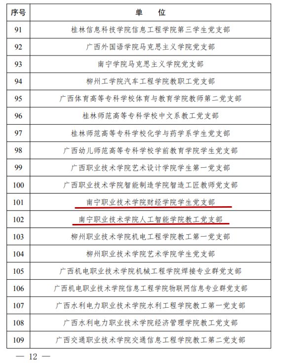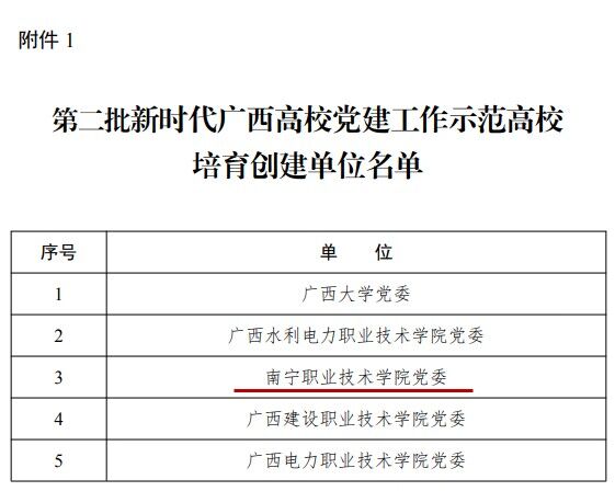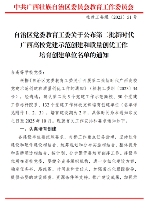 近日,自治区党委教育工委公布了第二批新时代广西高校党建示范创建和质量创优工作培育创建名单。学校党委成功入选“示范高校”培育创建单位;财经学院学生党支部、人工智能学院教工党支部入选“样板支部”培育创建单位。