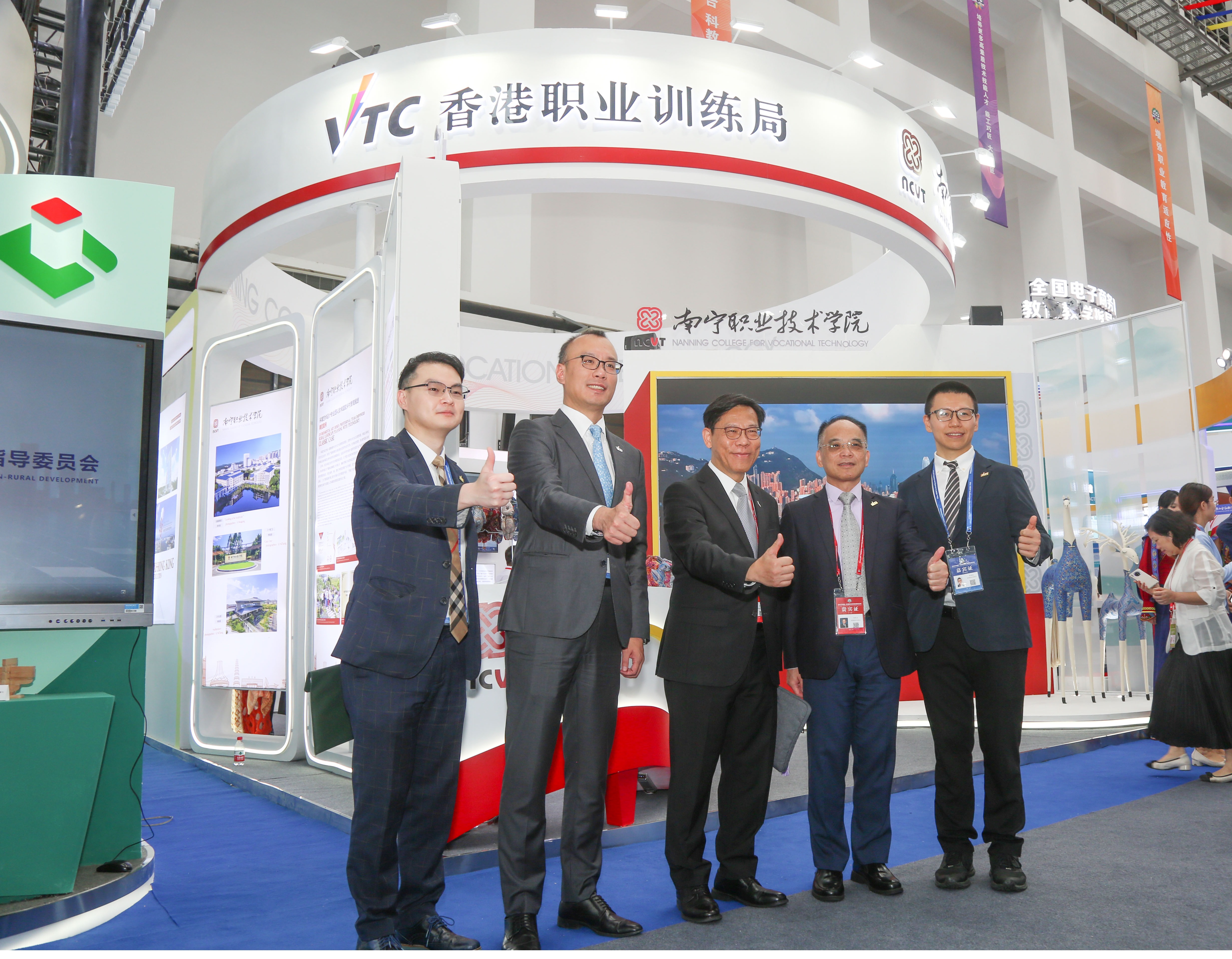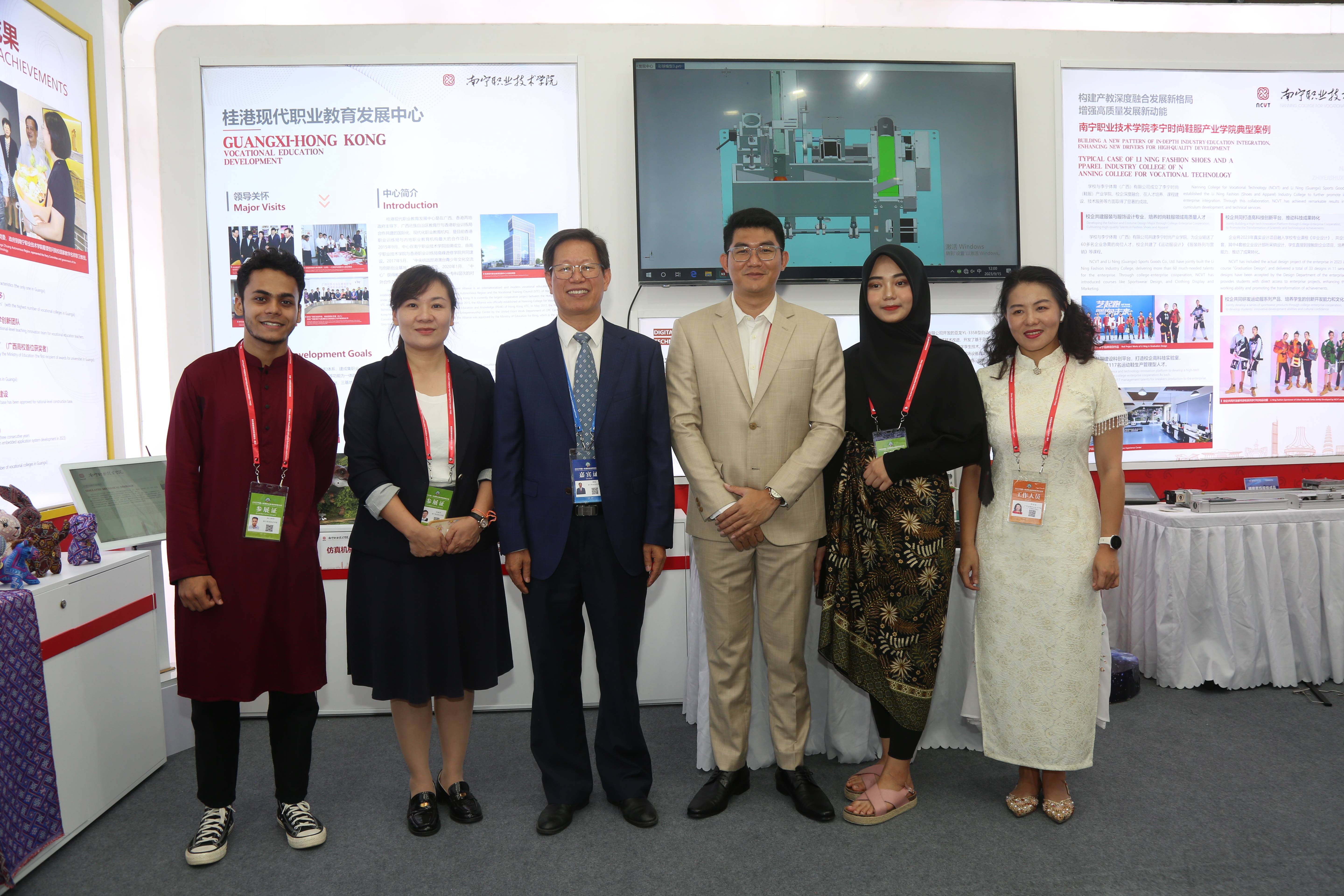 香港职业训练局执行干事唐智强(左三)一行在展台前合影(陈诚/摄)