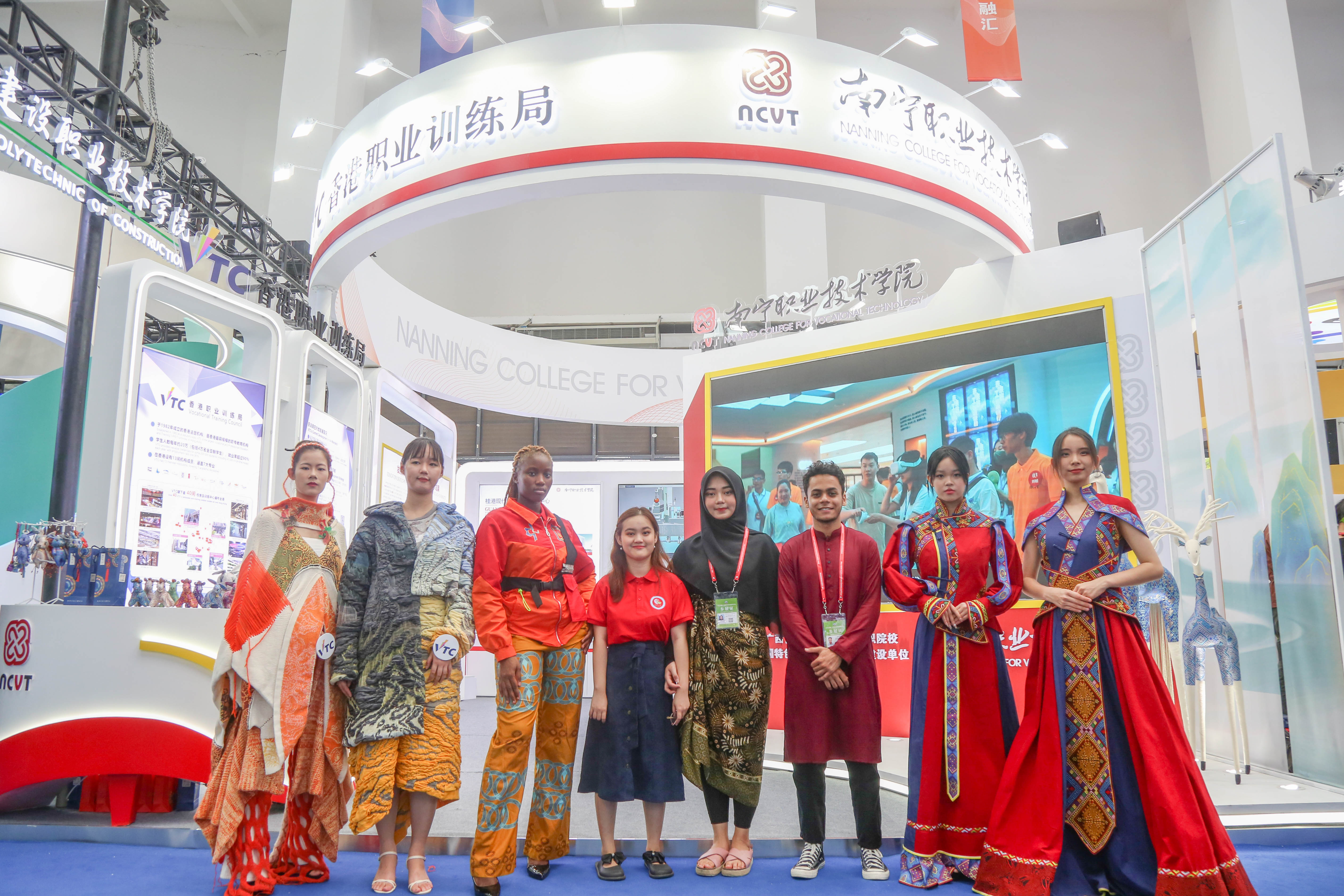 必赢官网留学生代表在2023中国—东盟职业教育联展暨论坛技术技能展上合影