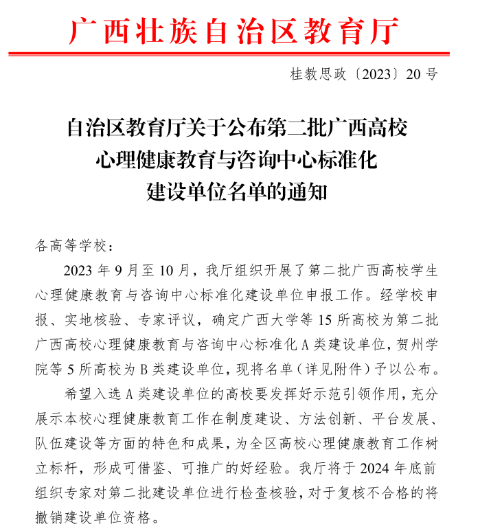 近日,自治区教育厅下发《关于公布第二批广西高校心理健康教育与咨询中心标准化建设单位名单的通知》,必赢官网成功获评为全区高校第二批心理健康教育与咨询中心标准化A类建设单位。