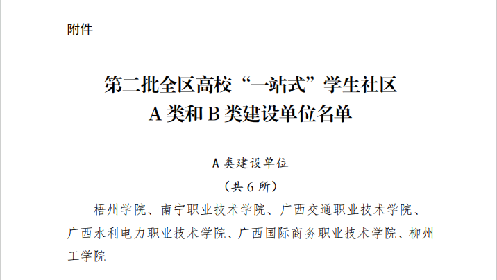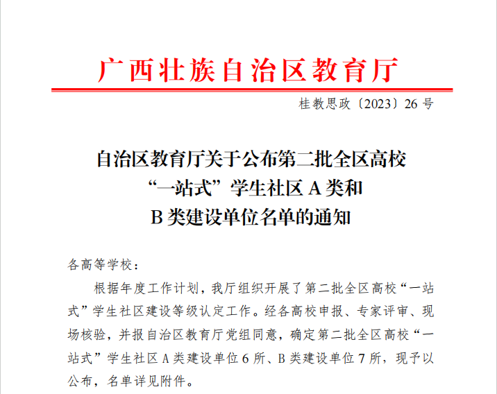 11月21日,广西壮族自治区教育厅下发《自治区教育厅关于公布第二批全区高校“一站式”学生社区A类和B类建设单位名单的通知》,必赢官网获第二批全区高校“一站式”学生社区A类建设单位。