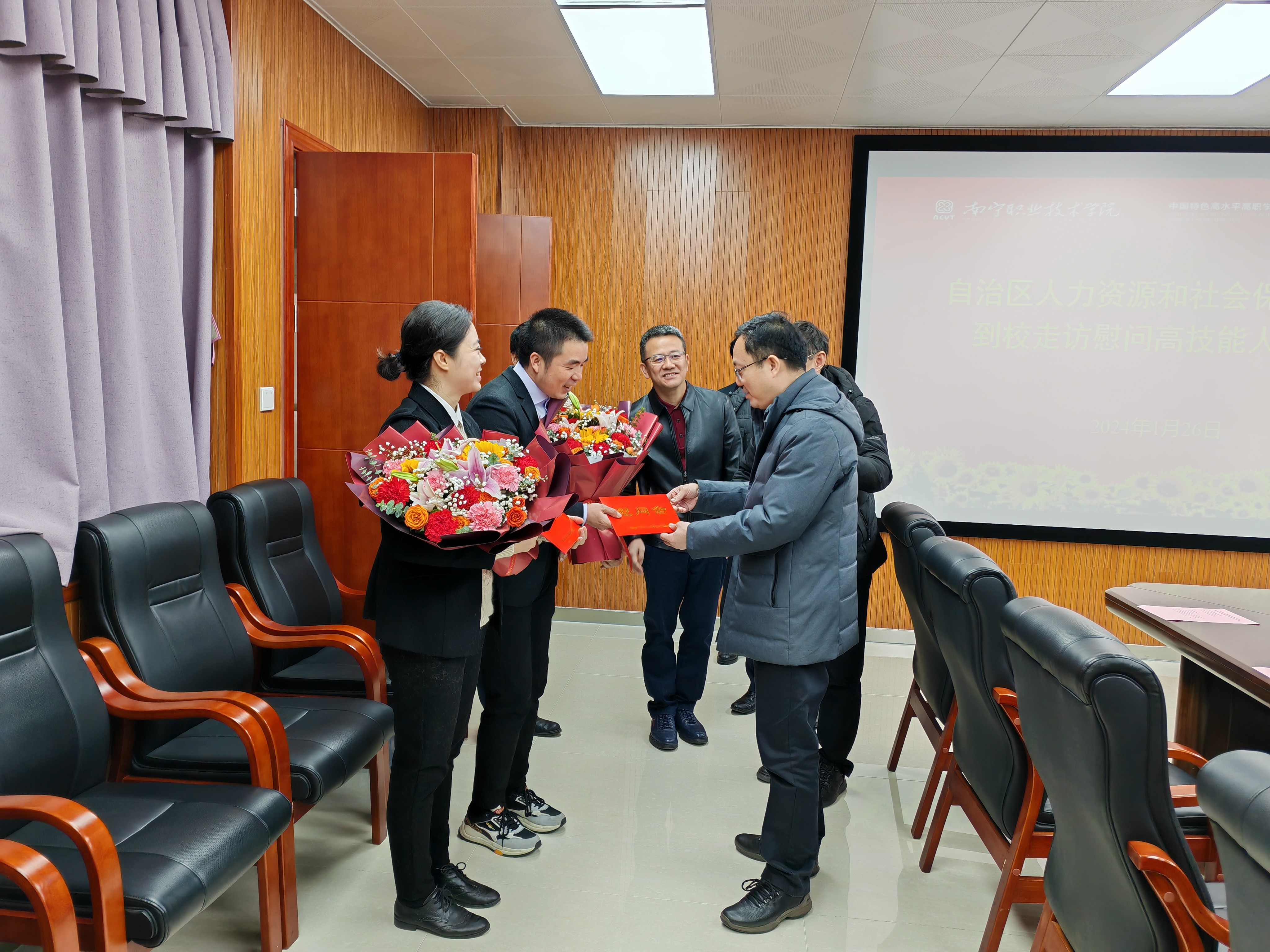 1月26日,自治区人力资源和社会保障厅党组成员、副厅长韦杰率队到必赢官网慰问周文军、黄宇婧两位高技能人才,向他们致以节日祝福和诚挚问候。