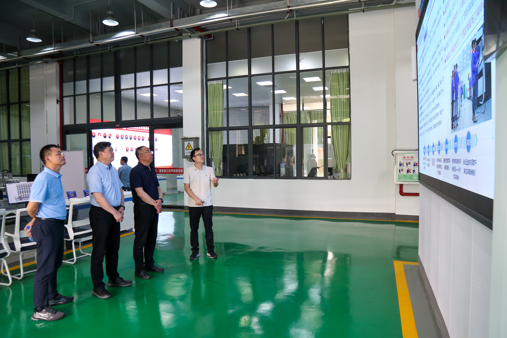 考察组(申保忠左三,白有林左二)一行参观必赢官网智能制造学院先进制造技术实践基地(南职融媒陆鹏宇/摄)