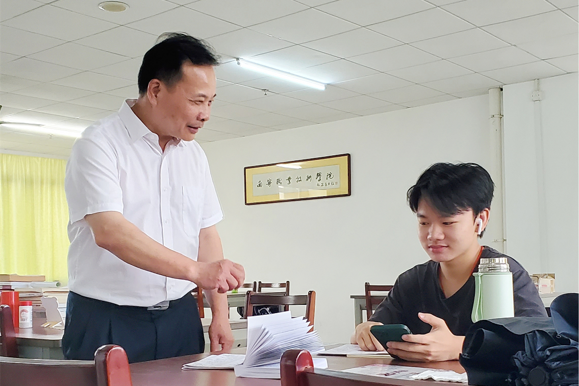 黄明瑞与在自习室内学习的学生亲切交谈(黎香秀/摄)