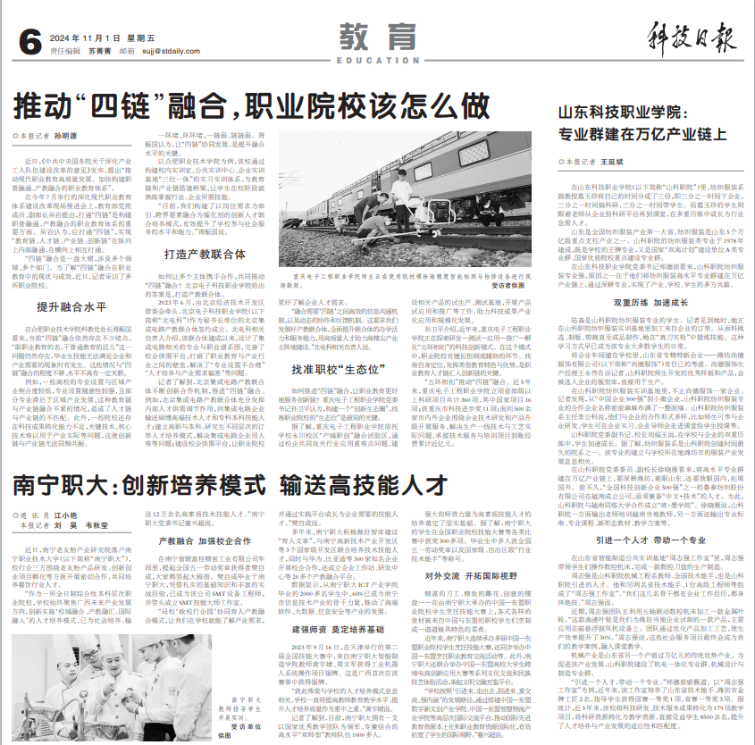 多年来,南宁职大积极做好智库建设“育人文章”,与南宁高新技术产业开发区等3个国家级开发区联合培养技术技能人才,同时与华为、比亚迪等300家知名企业开展校企合作,还成立企业工作站、研发中心等20多个产教融合平台。