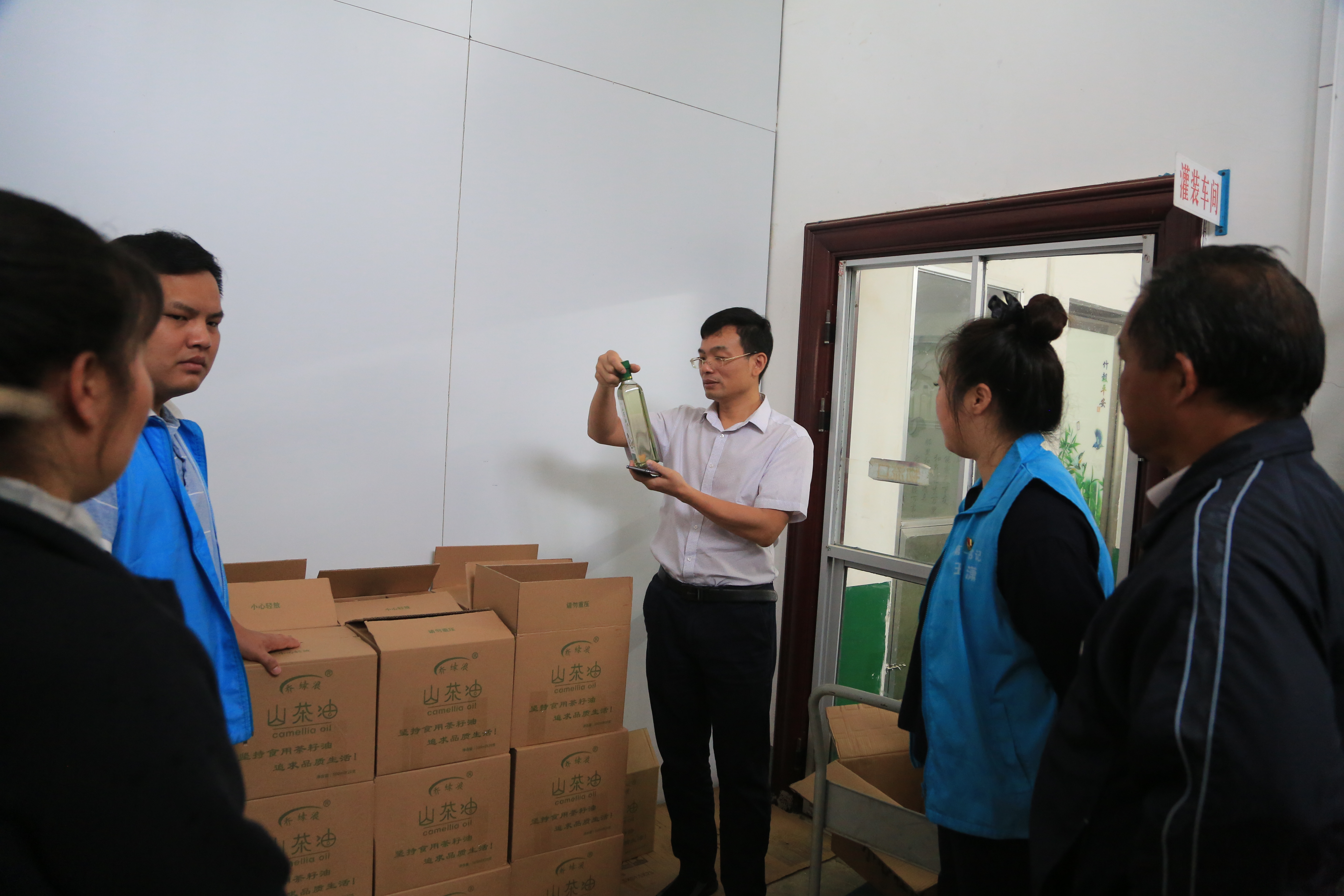 李东升调研绿浪村山茶油灌装车间(郑勇杰/摄)