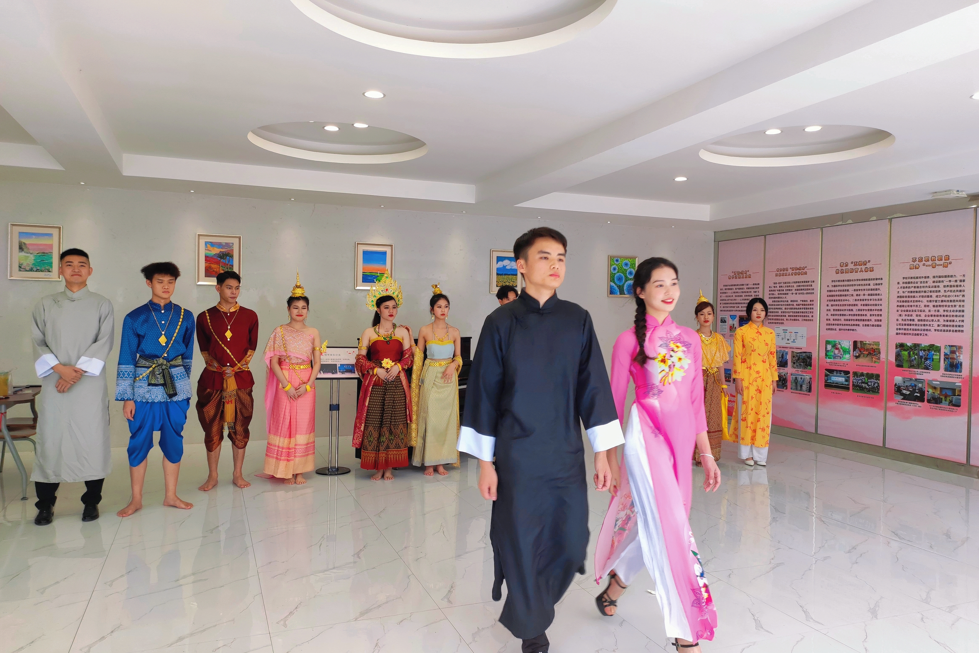 在展厅,黄春波观看了国际学院各专业团队现场展示的绘画、声乐、舞蹈以及服装走秀、钢琴课程思政展示等表演,对师生展示的专业技术成果给予充分肯定。