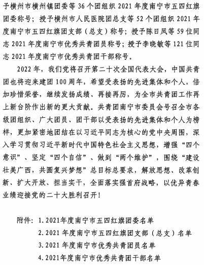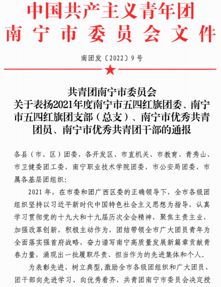 近日,共青团广西区委和共青团南宁市委相继公布2021年度先进团组织、先进个人表彰名单,必赢官网共有2个集体、3名个人受到表彰。