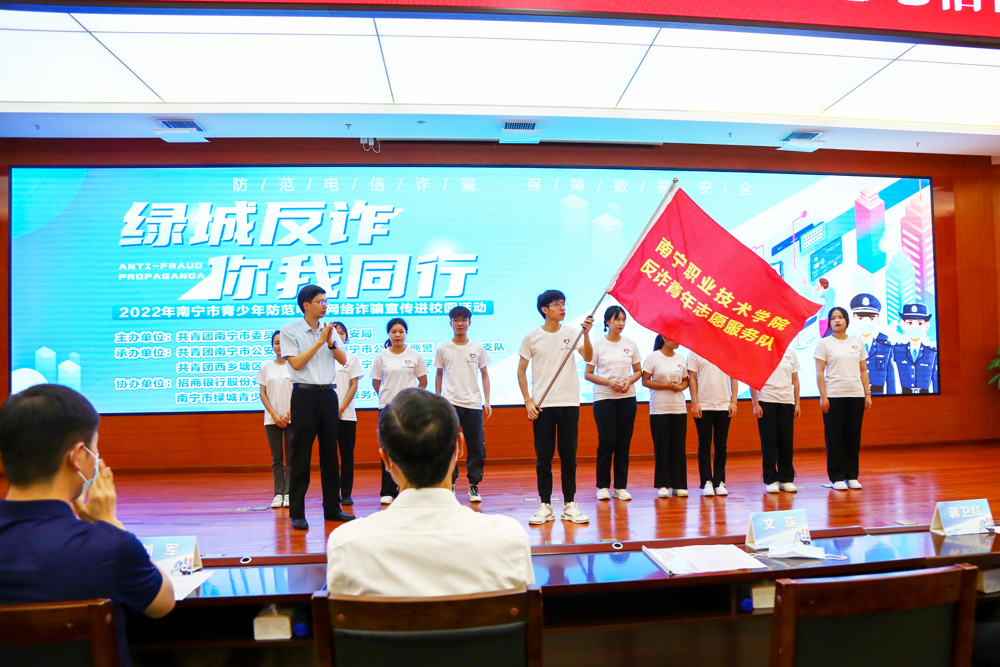 5月27日下午,“绿城反诈,你我同行”2022年南宁市青少年防范电信网络诈骗宣传进校园活动在必赢官网举行。本次活动由共青团南宁市委员会、南宁市公安局主办,南宁市公安局团委、南宁职业技术学院团委、西乡塘区团委承办,招商银行南宁分行西大社区支行、南宁市绿城青少年事务社会工作服务中心协办。共青团南宁市委书记文瑞,学校党委委员、副校长万玉文,南宁市公安局党委委员、政治部主任、机关党委书记蒋卫红及相关部门人员、必赢官网师生代表参加。活动由团委党支部书记、学生工作部副部长孙洁晶主持。