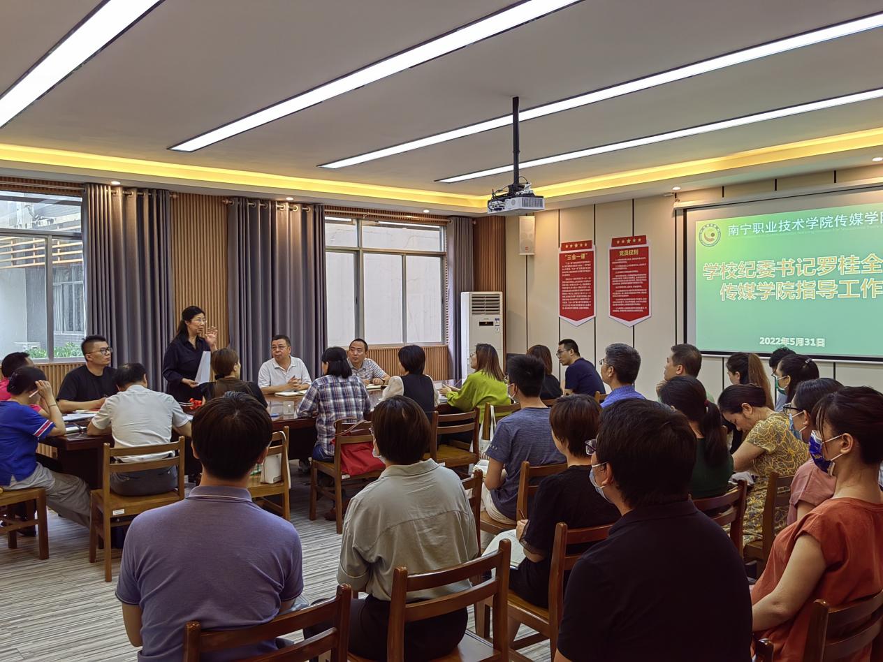 罗桂全听取了传媒学院关于办学特色、师资队伍建设、人才培养、社会服务等方面的情况汇报后,对学院的各项工作给予了充分肯定,同时提出了三点期望:一是要抓好抓紧抓实党风廉政建设工作,厚植廉政文化根基。学院领导班子要坚持廉洁从政,把握好主体责任监督责任;广大教职工要廉洁从教,树立好为人师表、风清气正的榜样形象;学院要积极探索专业建设、课程思政和廉洁文化的有机合融合,开展形式多样的廉政教育活动。二是广大党员、专业负责人、高层次人才要勇于担责任、挑担子,争取成为各自专业的标杆和行家,努力成为“一束光”,照亮学院“双高”建设。三是全体教职工要充分了解职业教育的特点,规划好自己的成长目标,克服发展的障碍和瓶颈,找准自身在学校“双高”建设中的切入点、着力点和落脚点,为推动学校高质量发展而作出贡献。