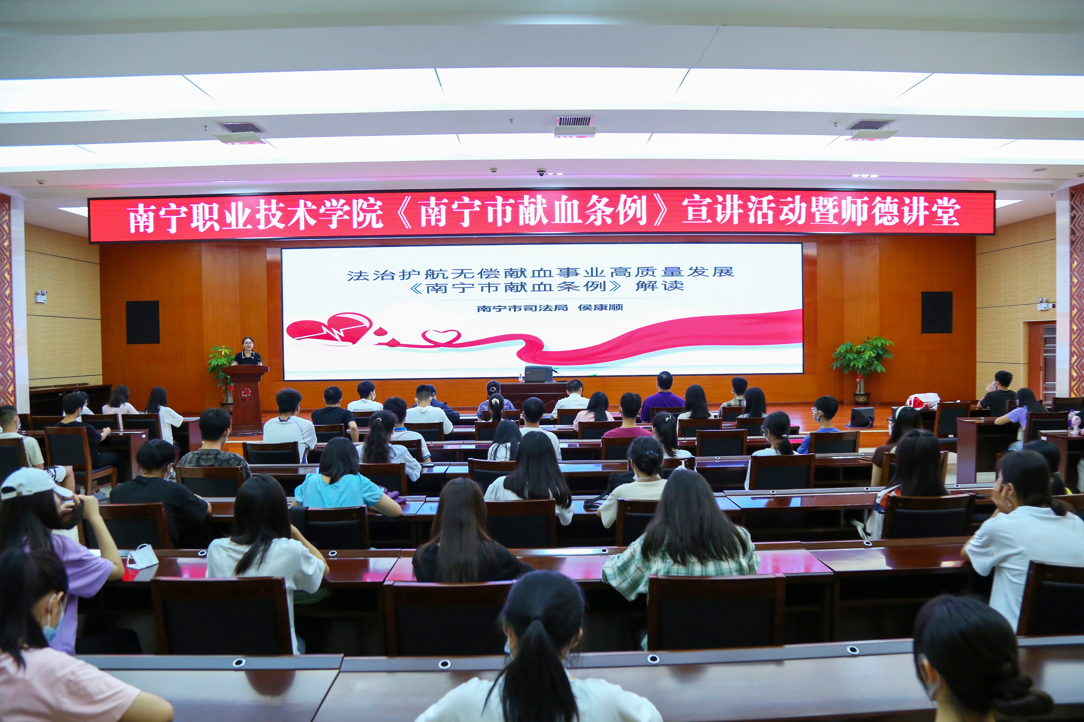 侯康顺从南宁市的献血立法,《南宁市献血条例》的主要内容、贯彻实施等多个方面,深刻阐述参与无偿献血、培育和践行社会主义核心价值观的重要意义,鼓励和号召广大师生积极踊跃地参与到无偿献血公益事业中。