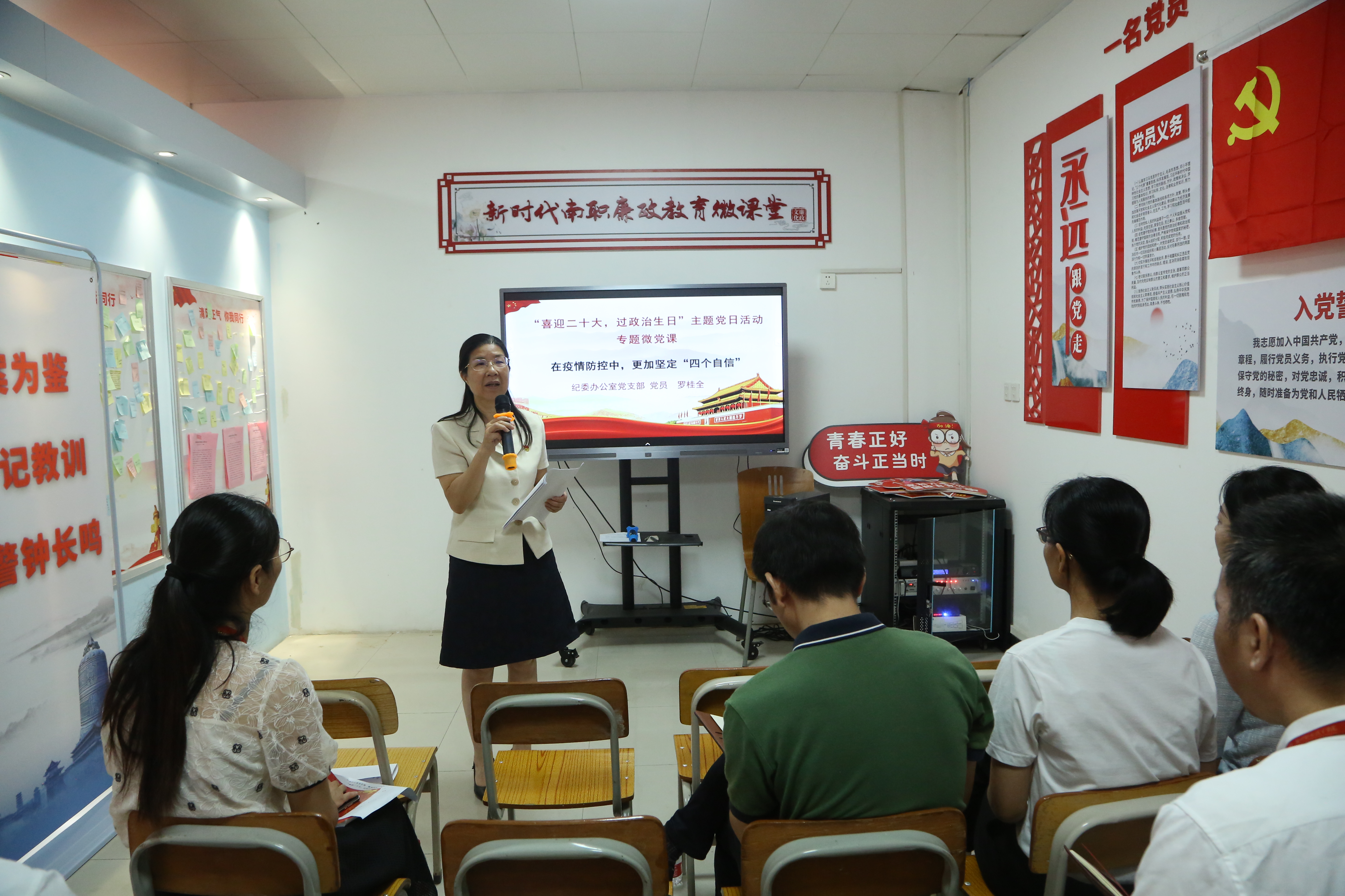 罗桂全为支部党员上了一堂题为《在疫情防控中,更加坚定“四个自信”》的专题微党课。她结合疫情防控的生动事例,诠释了“四个自信”的重大意义。