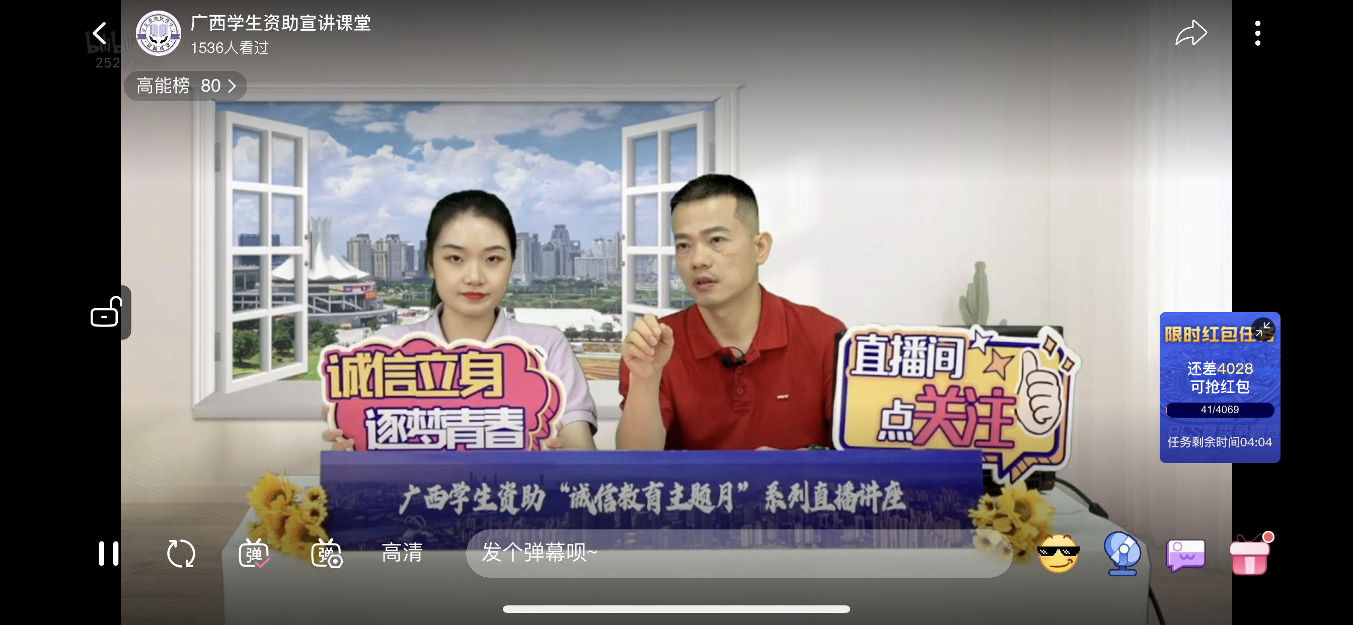 本次直播讲座有3个直播间。其中1号直播间由彭慧羚主持,主讲嘉宾是南宁师范大学学工部(处)部(处)长、武装部部长、学生资助中心主任邓军彪,直播讲座的主题是《“诚”与“法”那些事》,主要针对高校大学生在学校违纪、校园贷与维权、防诈骗和如何提高自我防范意识等知识进行讲述。2号直播间由吴嘉怡主持,主讲嘉宾是南宁金控大数据公司副总经理李乾,直播主题是《断卡行动进行时》,主要针对什么是“断卡”、如何“断卡”、“断卡”之后会有什么不良的影响以及树立正确的消费观和价值观等进行讲解。3号厅直播间由赖静主持,主讲嘉宾是广西北投供应链科技股份有限公司总经理刘晓宇,直播主题是《大学生必备基础金融知识》,包括如何正确看待信用卡、个人征信报告对未来信贷的影响以及理财的基本知识等。