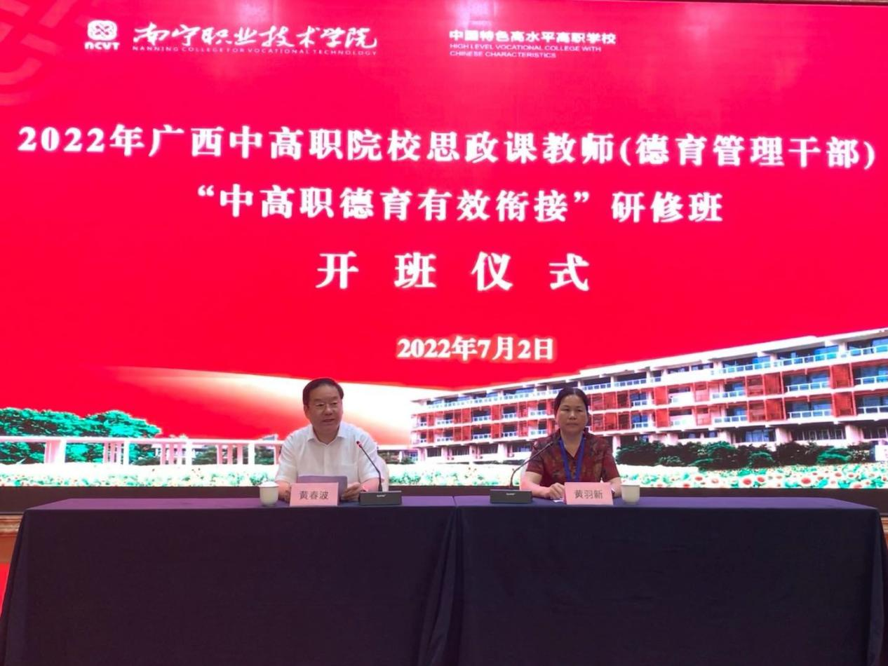 为进一步提升思政课教师(德育管理干部)的政治素质及业务水平,建设一支政治强、情怀深、思维新、自律严、人格正的思政课教师队伍,7月1日至3日,必赢官网举办了2022年广西中高职院校思政课教师(德育管理干部)“中高职德育有效衔接”研修班,共来自全区10所中高职院校的教师代表参加本次研修班。