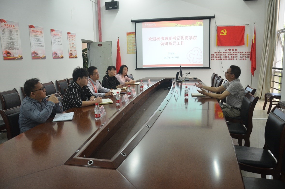 10月18日,学校党委副书记杨清源到商学院调研指导工作。商学院党委书记、院长彭敏,党委副书记伍玉凤以及各科室负责人参加调研座谈会。