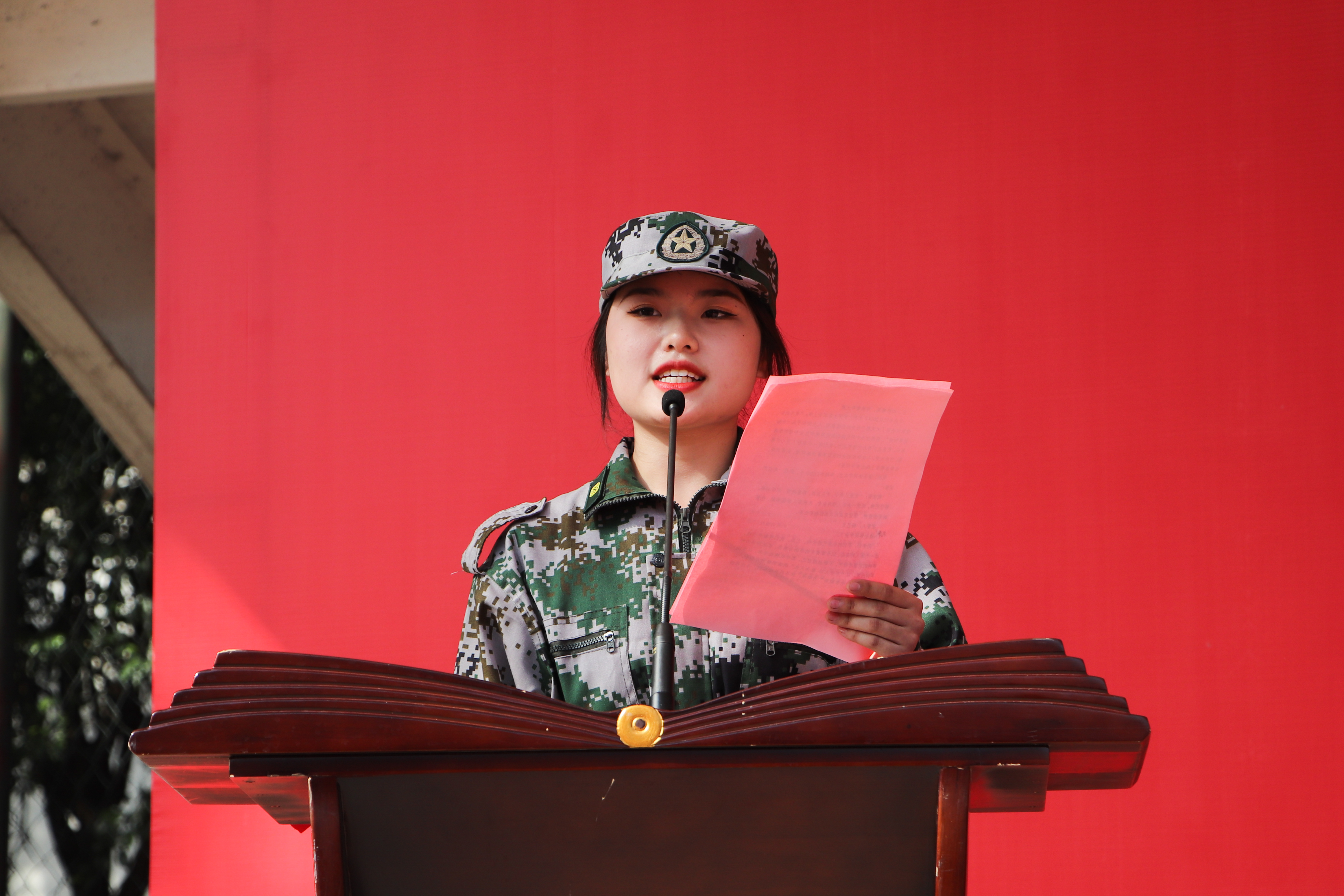新生参训代表杨艺文发言宣誓,并表示在军训过程中坚定意志,传承军人爱国奉献、吃苦耐劳的精神,在体力和精神的双重考验中不断战胜自己。