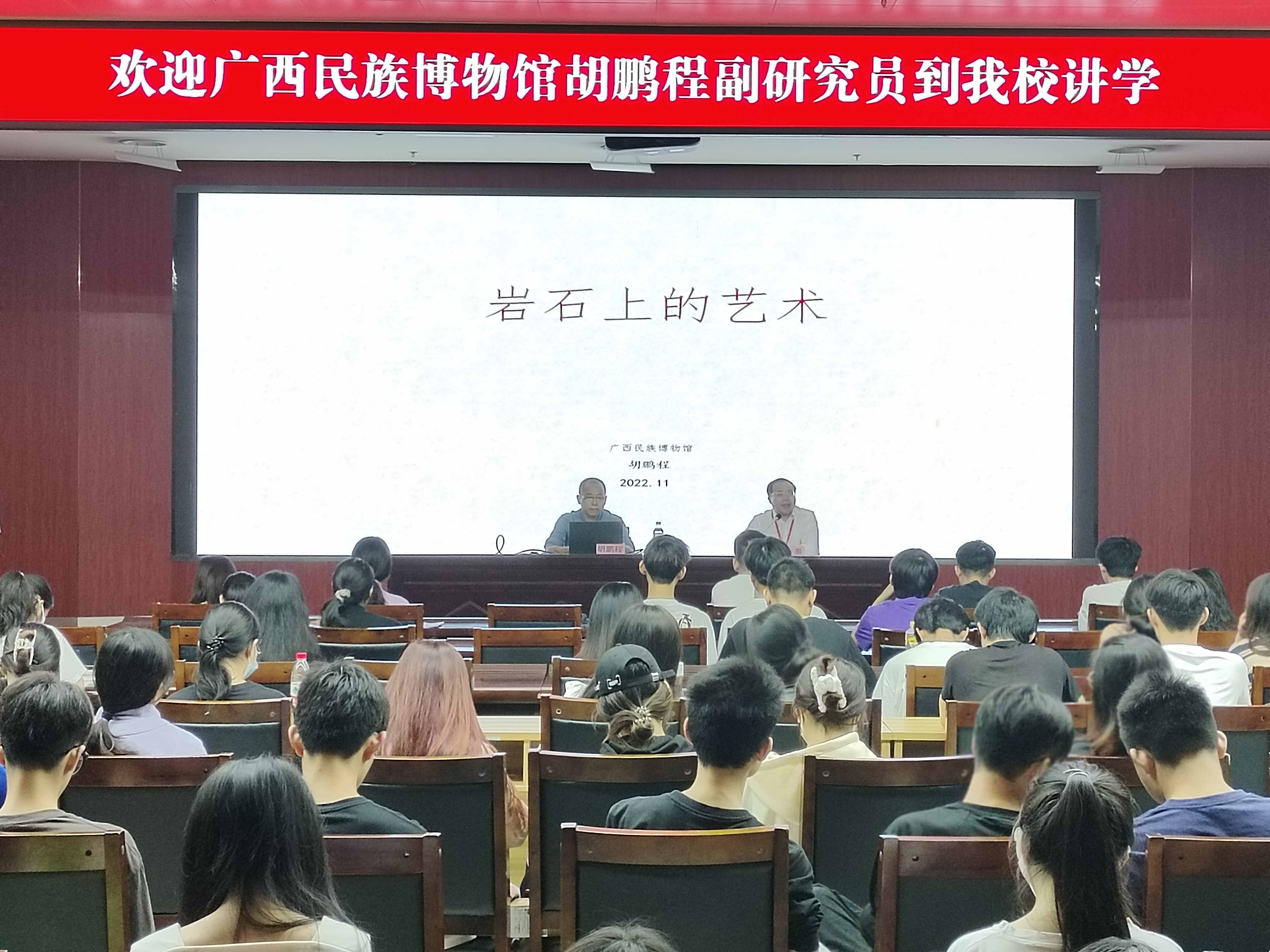 11月22日晚,人文大讲堂——岩石上的艺术在必赢官网学术中心3号厅举行,广西民族博物馆副研究员胡鹏程受邀为必赢官网近200名学生作了精彩的讲述。讲座由人文教育学院党支部书记、副院长王景主持。