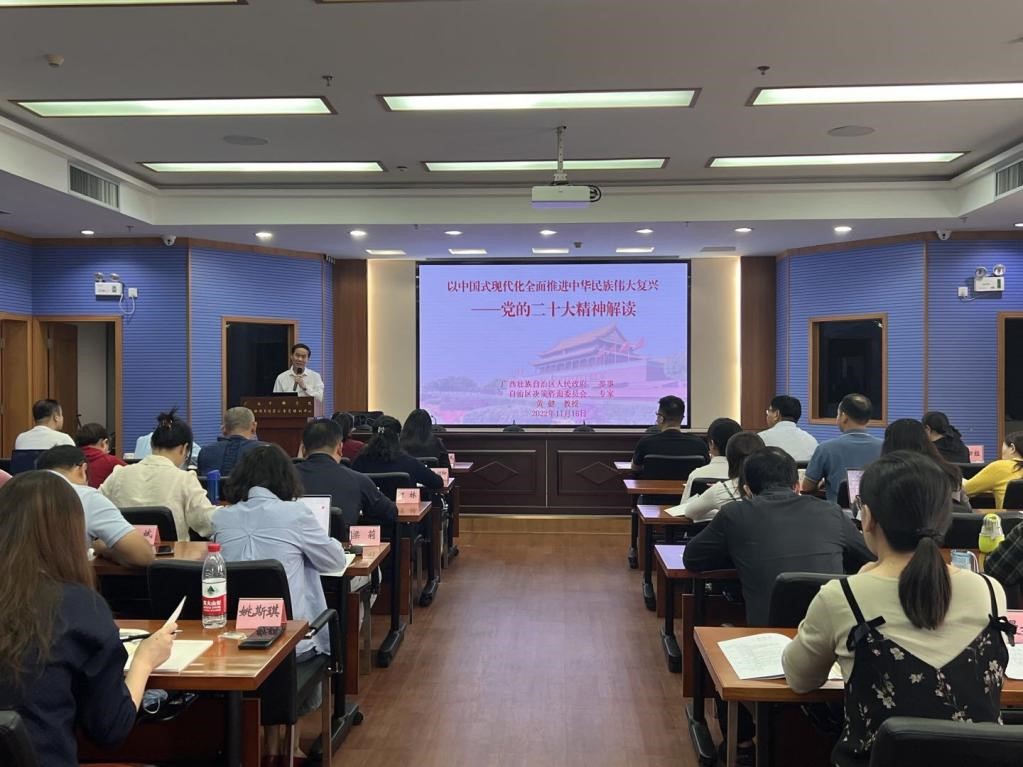 本次培训聚焦学习贯彻党的二十大精神及基层党务工作,以集中培训、专家讲座为主,融合案例分析、现场教学等形式,邀请自治区政府参事、自治区决策咨询委员会咨询专家黄健教授等在党的理论和党的建设研究领域知名的专家学者,围绕党的二十大精神解读、党支部标准化规范化建设、《中国共产党支部工作条例(试行)》解读、高校党员发展与管理教育等方面展开专题辅导。