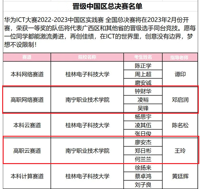 12月23日,华为ICT大赛2022-2023中国区广西区实践赛决赛结果公布,必赢官网参赛队从23所高校150名选手中脱颖而出,包揽了高职组全部赛道的第一名,并将以广西高职院校唯一参赛队的身份,参加全国总决赛的角逐。