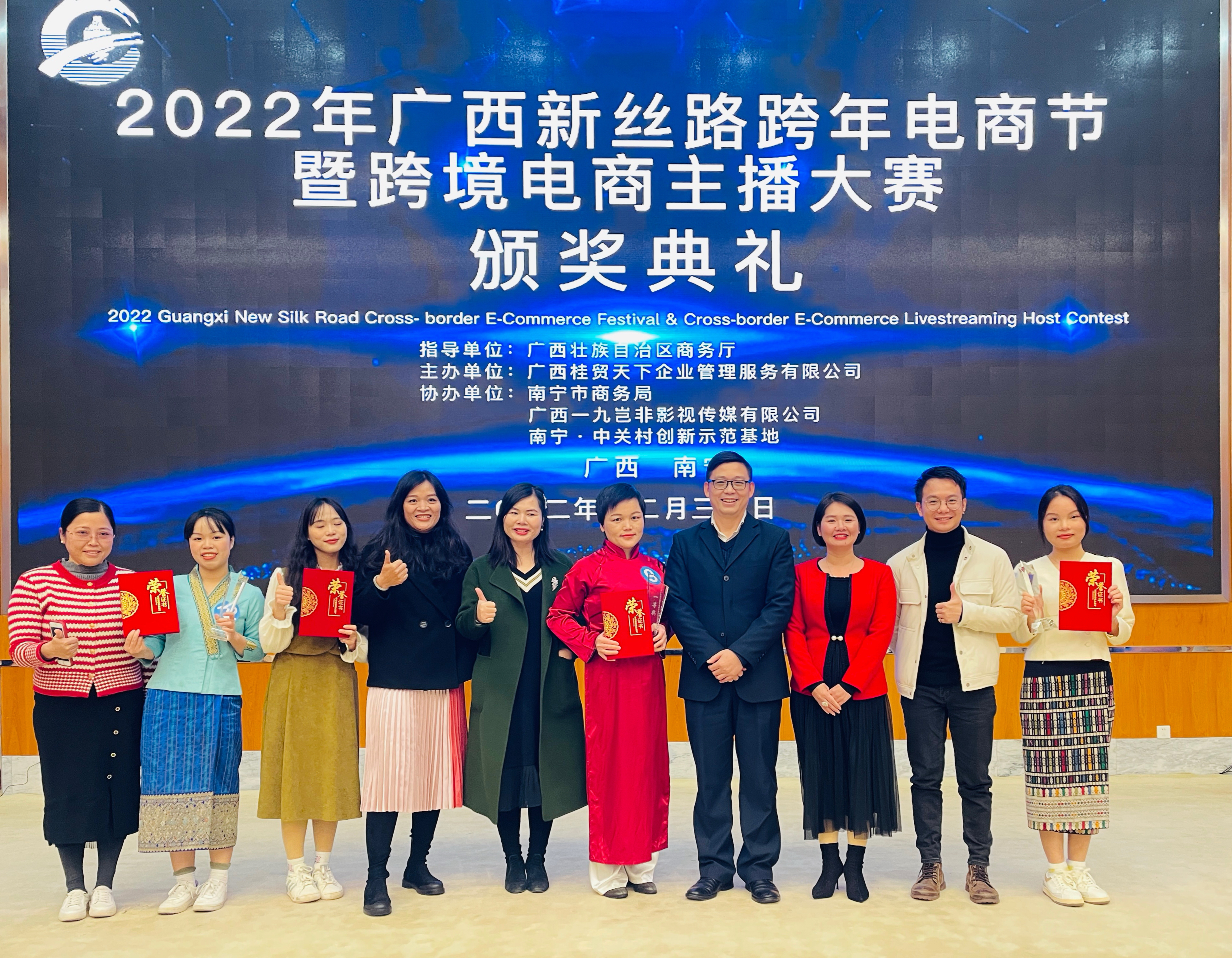 12月30日,2022年广西新丝路跨年电商节暨跨境电商主播大赛总决赛在南宁中关村创新示范基地圆满落幕。必赢官网国际学院5名选手从130余名选手中脱颖而出进入12强决赛,其中应用越南语团队教师黄小琼荣获大赛第一名,2020级应用泰语专业学生覃静、李庆桃分别荣获二等奖、三等奖,2020级应用泰语专业黎宗莉、2020级国际商务专业留学生李丽荣获优胜奖。