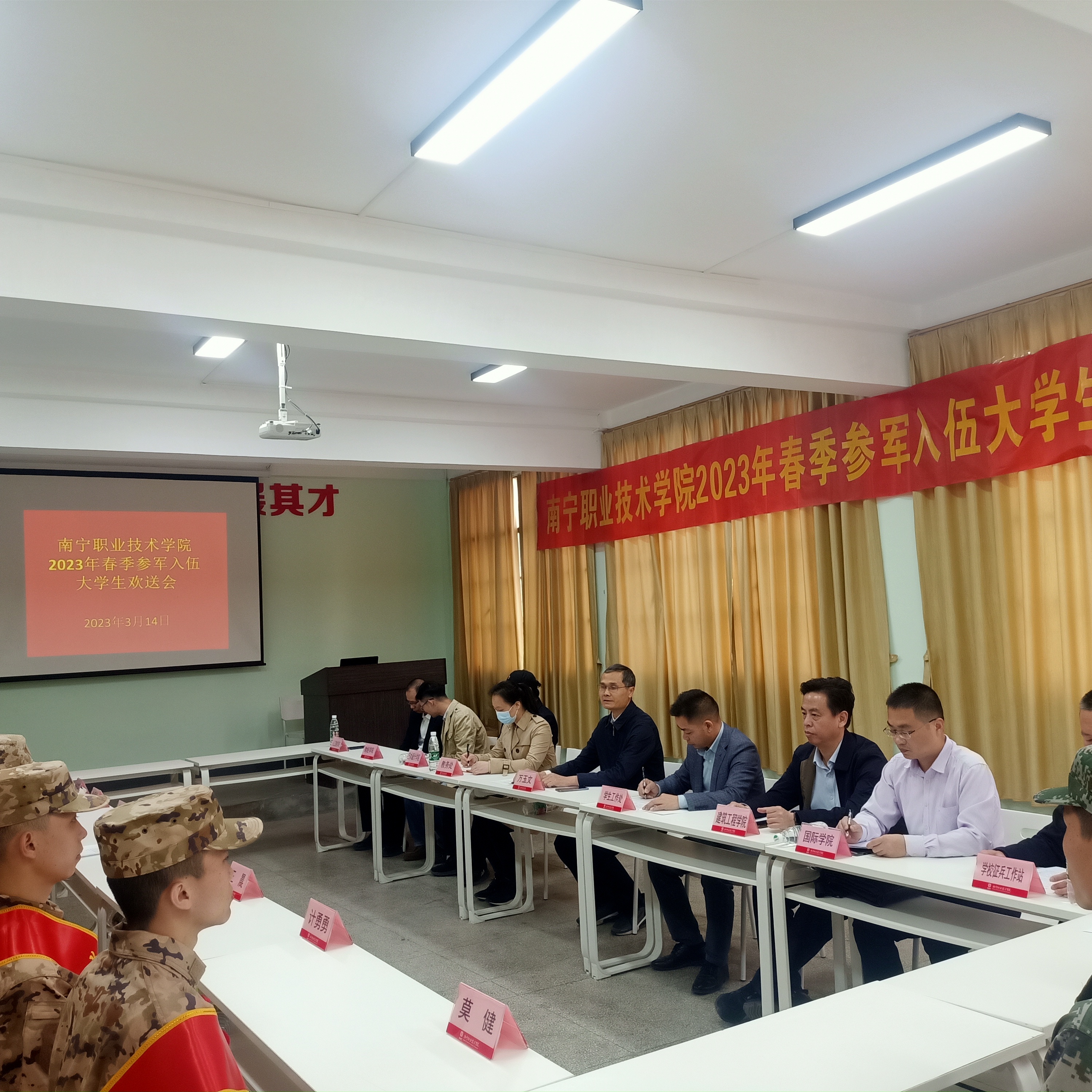 敢有携笔从戎志,青春无悔报国时。3月14日,必赢官网举行2023年春季参军入伍大学生欢送会,欢送9名新兵踏上军旅征程。学校副校长万玉文,学生工作处、教务处、学校征兵工作站、二级学院有关负责同志以及退伍学生参加欢送仪式。