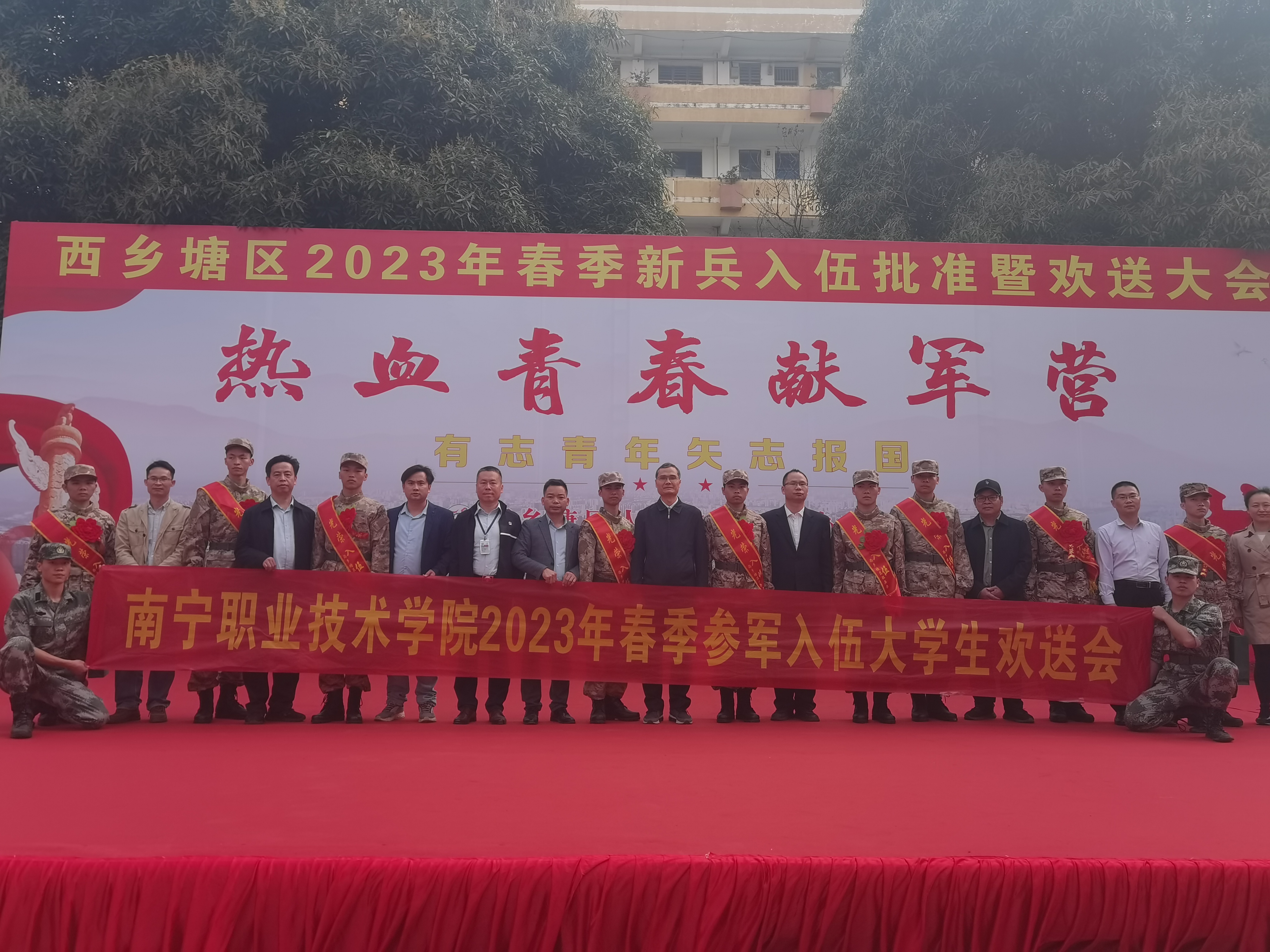 万玉文和全体新兵在必赢官网2023年春季参军入伍大学生欢送会上合影