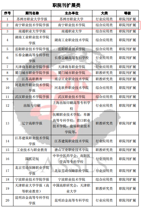 3月15日,中国社会科学评价研究院发布《中国职业高等院校期刊AMI 综合评价报告(2022 年)》(AMI期刊目录),报告对全国164种职业高等院校期刊进行评价,最后评出14种“职院刊核心期刊”,43种“职院刊扩展期刊”,107种“职院刊入库期刊”。《南宁职业技术学院学报》名列“职院刊扩展期刊”第2名,在全国164种职业高等院校期刊中名列第16位。