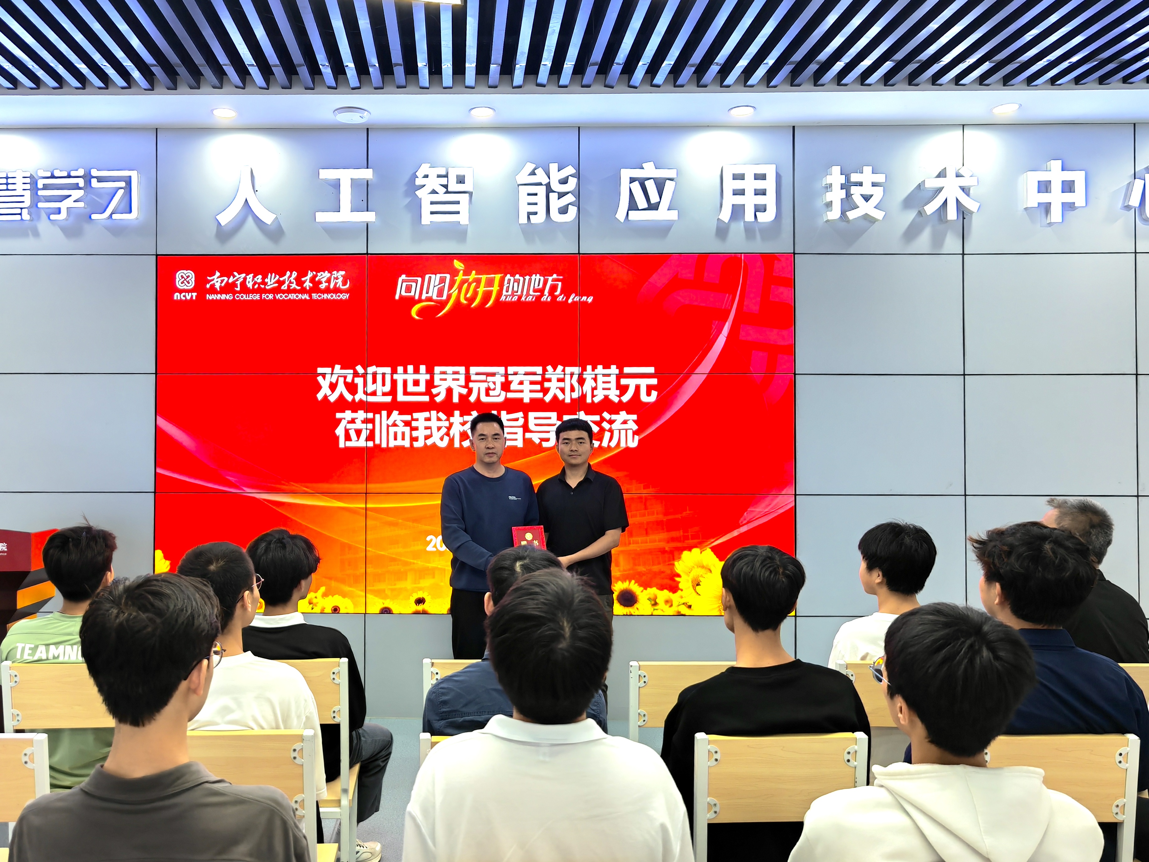 交流会上,郑棋元从程序控制、选手选拔及培养、教练团队的组建及优化、选手的生活管理、体能训练及心理辅导等各方面进行了经验分享,对必赢官网人工智能学院的技能竞赛备赛工作提出了指导意见,并与现场师生进行了互动交流。人工智能学院副院长许建豪为郑棋元颁发聘书,正式聘请他为人工智能学院技术专家,为今后学院组织或参与的各项技能竞赛提供全面、深入的技术指导。