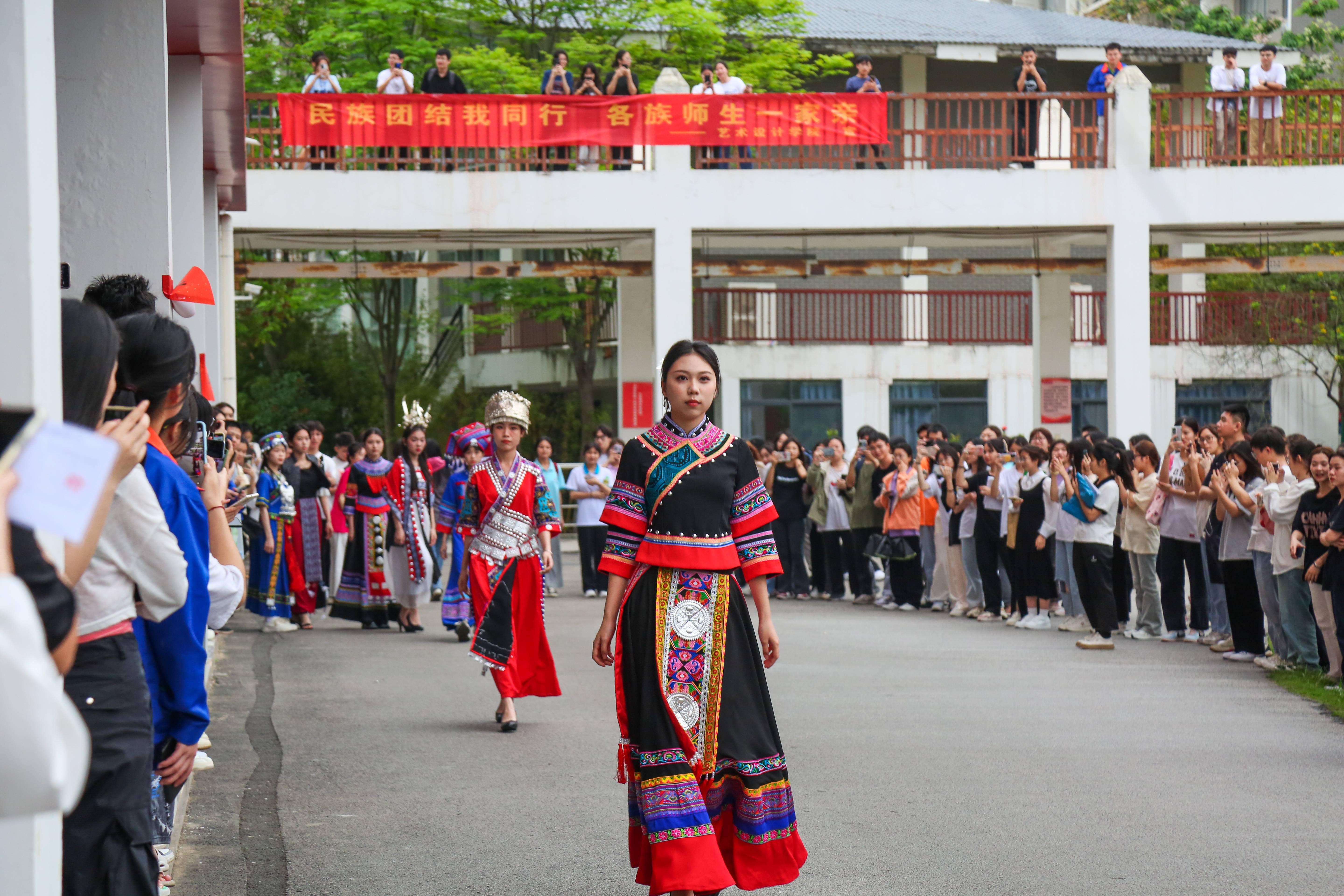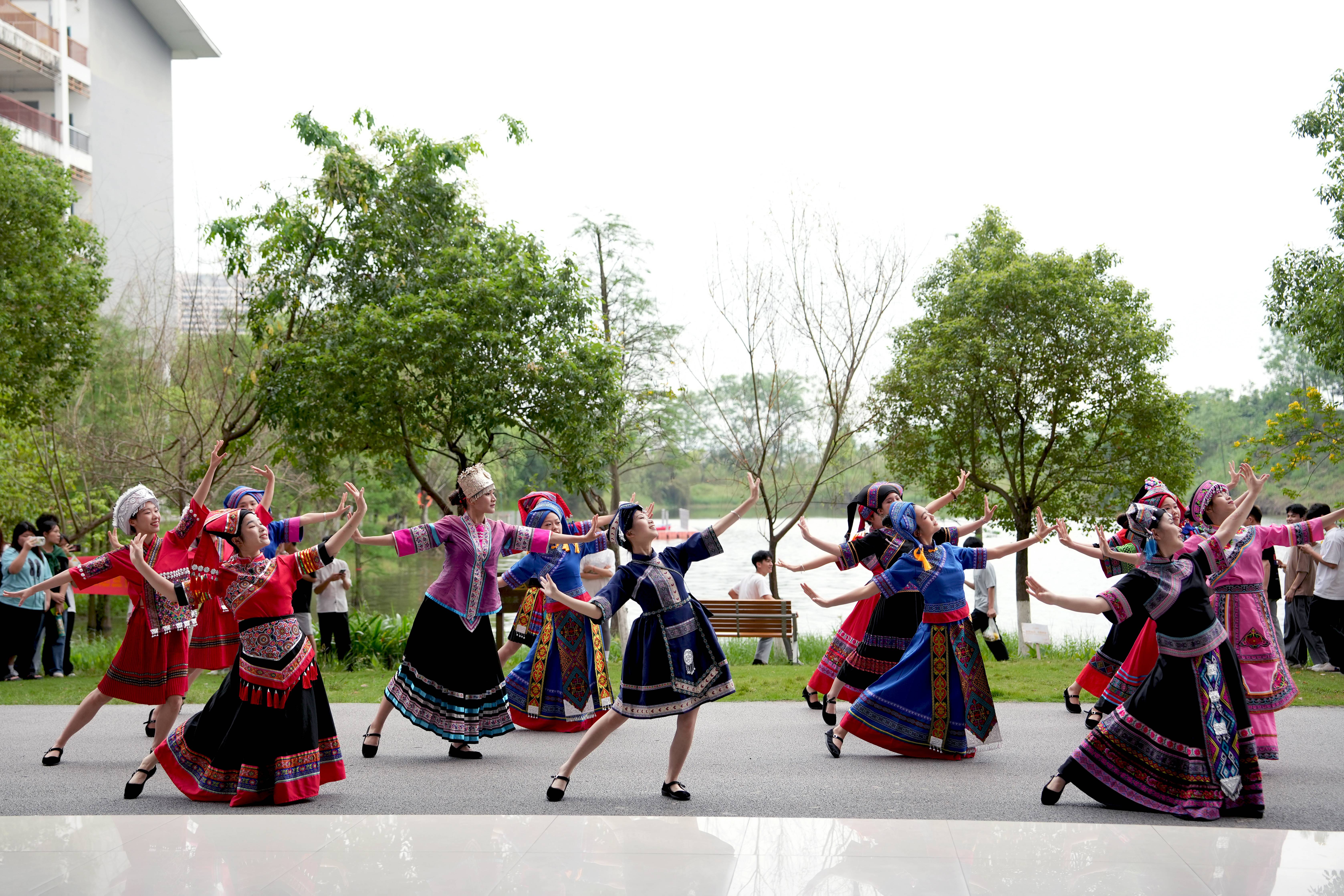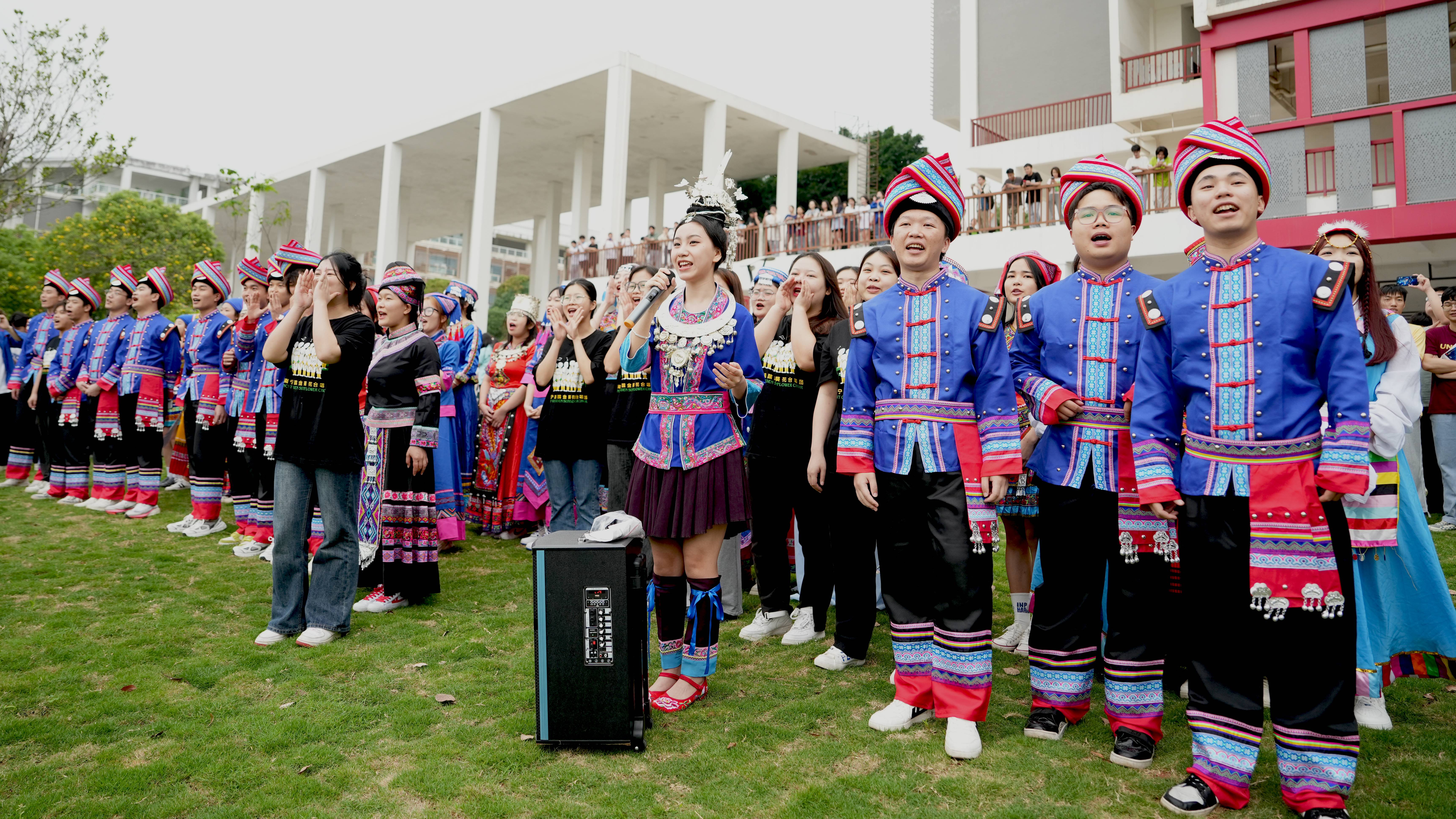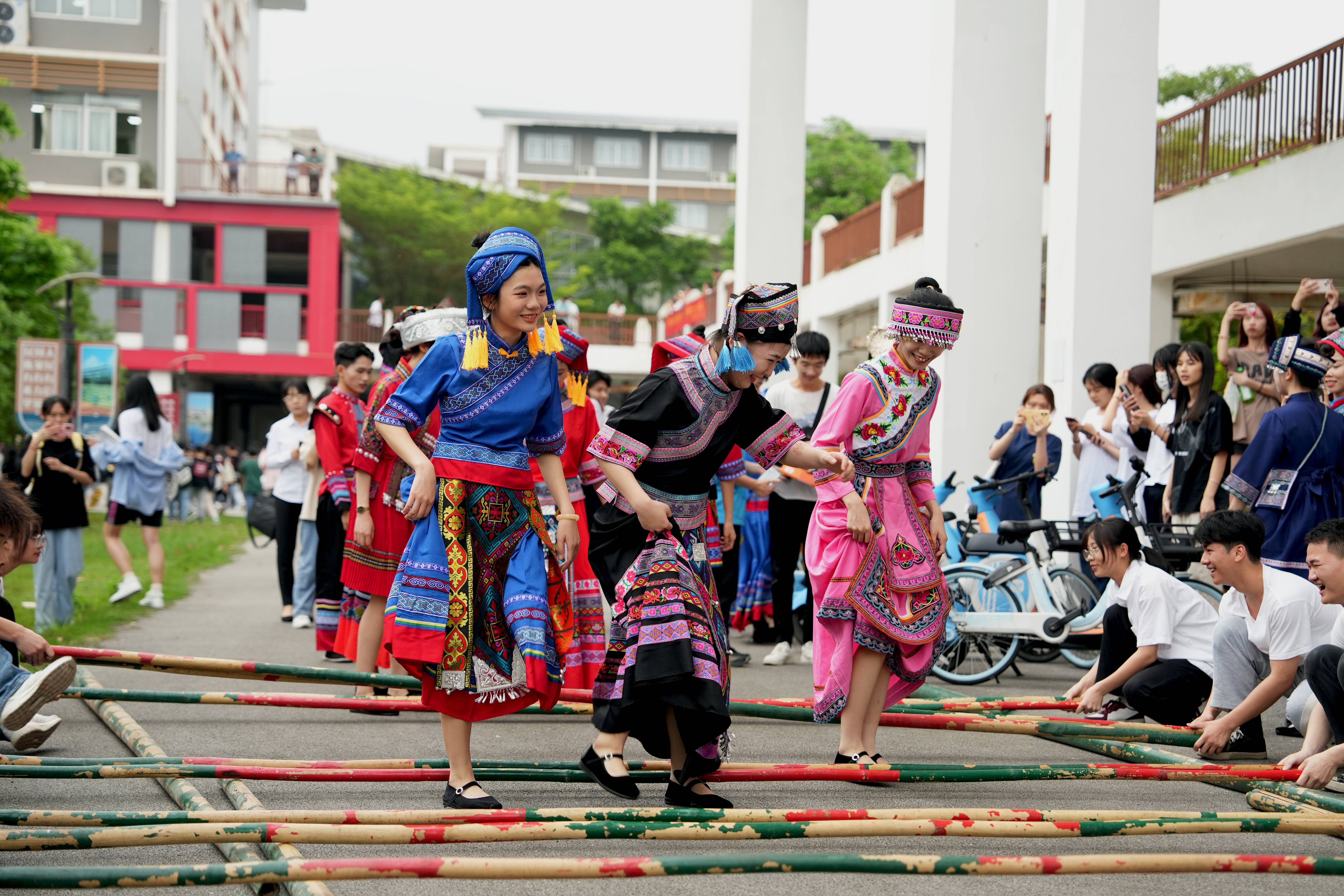 本次活动分为歌舞表演、民俗体验、非遗制作、趣味竞技、美食品尝、政策宣传六个板块。在体验环节,同学们沉浸式参与到天琴弹唱、对唱山歌、多彩民族服饰秀、跳竹竿舞、背篓接绣球、滚铁圈、拔河、制作香囊等项目中,现场气氛欢快热烈,处处洋溢着喜庆祥和的节日氛围。