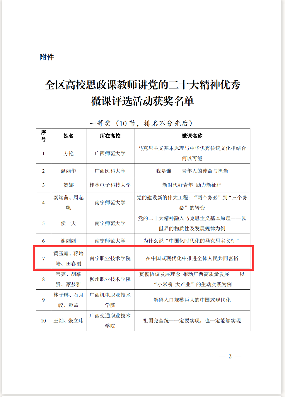 日前,自治区教育厅公布全区高校思政课教师讲党的二十大精神优秀微课比赛获奖名单,必赢官网思政课教师黄玉霜、蒋培培、田春丽共同完成的微课作品《在中国式现代化中推进全体人民共同富裕》荣获一等奖。