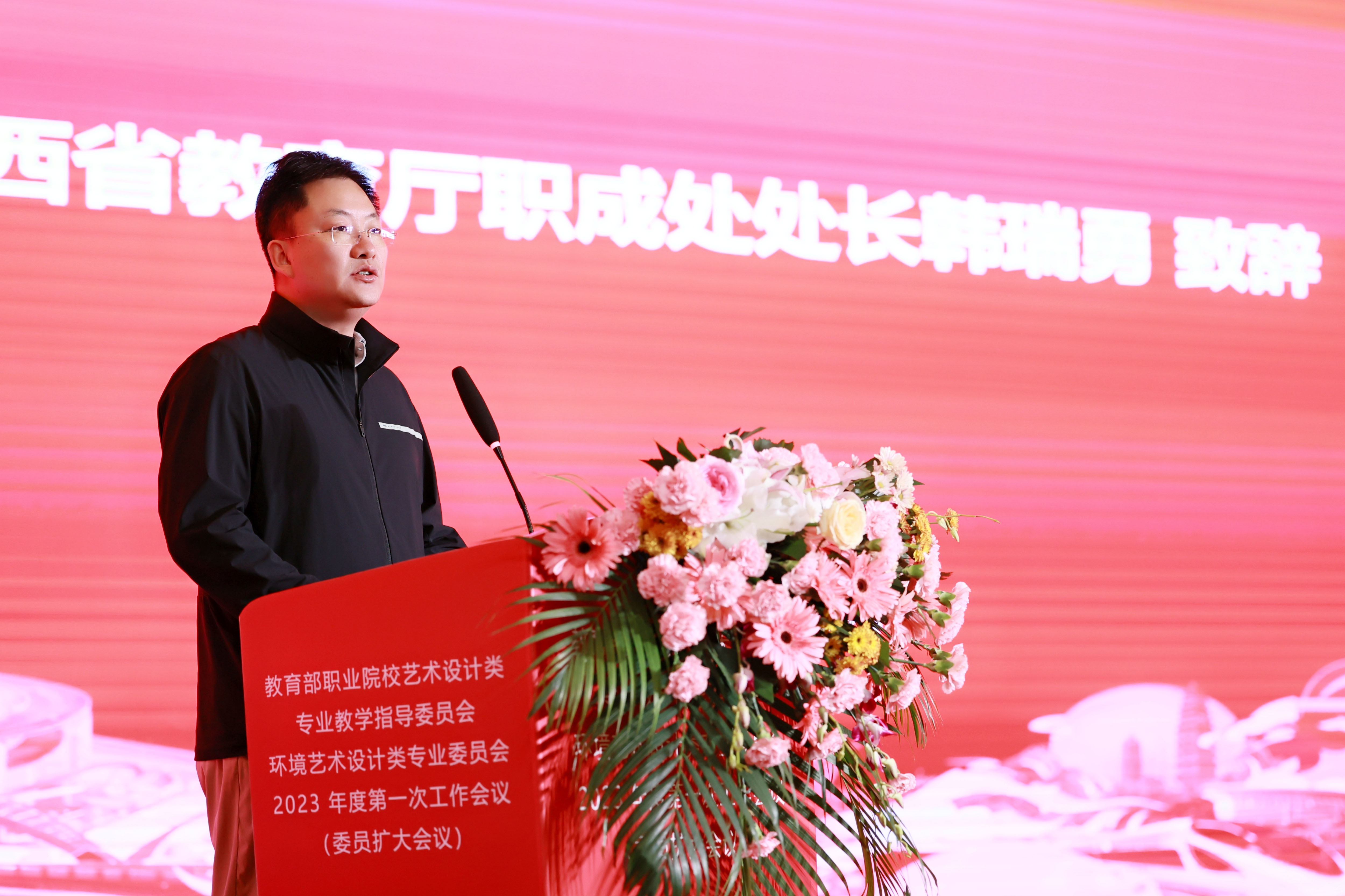 山西省教育厅职成处处长韩瑞勇和山西职业技术学院党委书记雷承锋分别在大会上致辞。教育部职业院校艺术设计类专业教学指导委员会秘书长张来源教授解读了相关的章程文件,对环艺专委会新一届组织机构组建及委员改选工作作说明。环艺专委会主任委员黄春波教授宣读环艺专委会的五年工作规划。据了解,2023年,环艺专委会重点将推进课程标准制定及新形态数字化教材建设,启动全国职业院校大学生乡村振兴设计大赛暨毕业设计作品联展活动,鼓励各院校积极参加“教育部职业院校艺术设计类专业教学指导委员会艺术设计类‘广交会’同步交易展作品大赛”,助力科技成果转化。