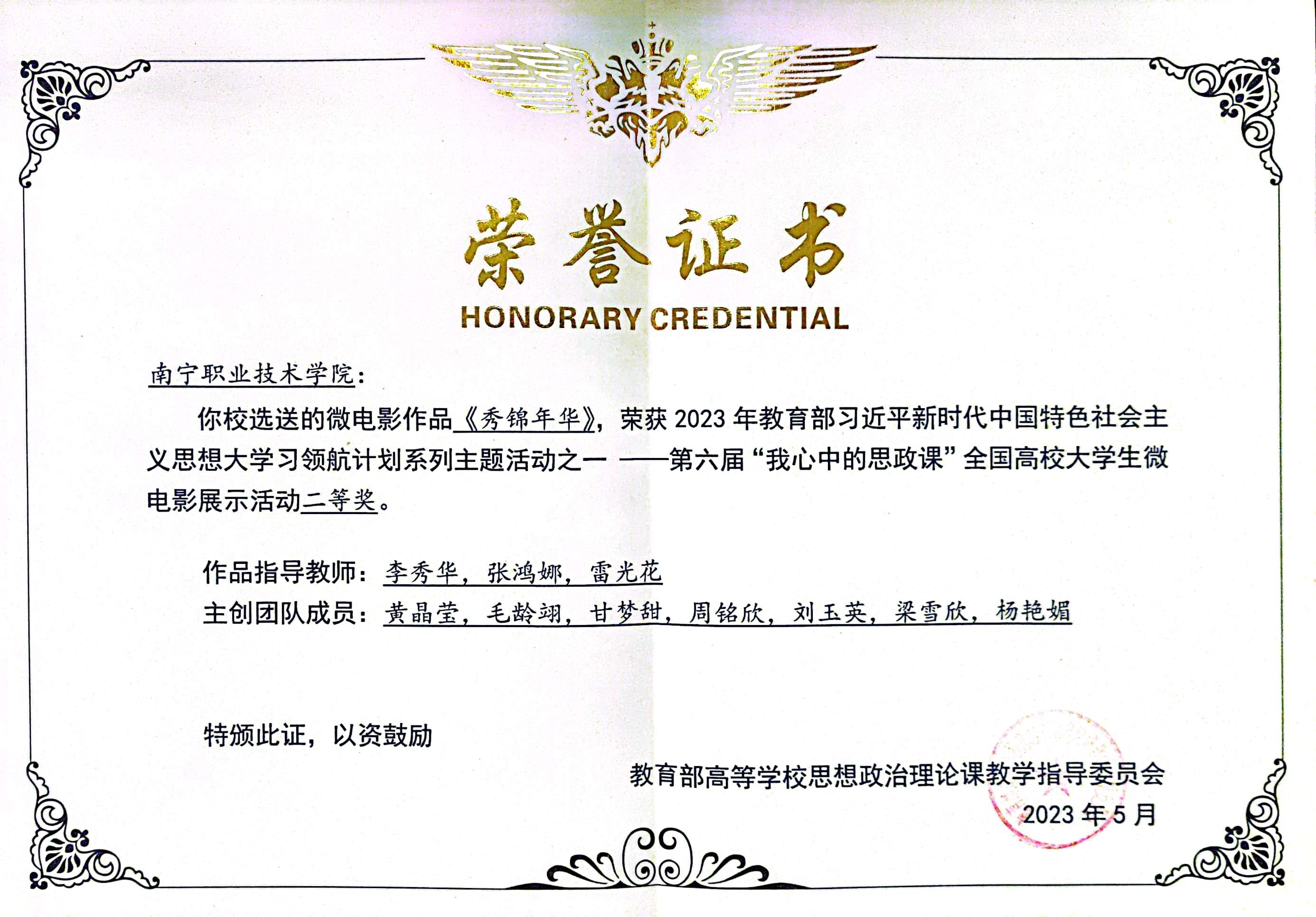 近日,第六届“我心中的思政课”全国高校大学生微电影展示活动颁奖典礼在武汉大学隆重举行。必赢官网马克思主义学院教师李秀华、张鸿娜、雷光花指导,传媒学院黄晶莹等7位同学主演的微电影作品《秀锦年华》荣获全国二等奖。