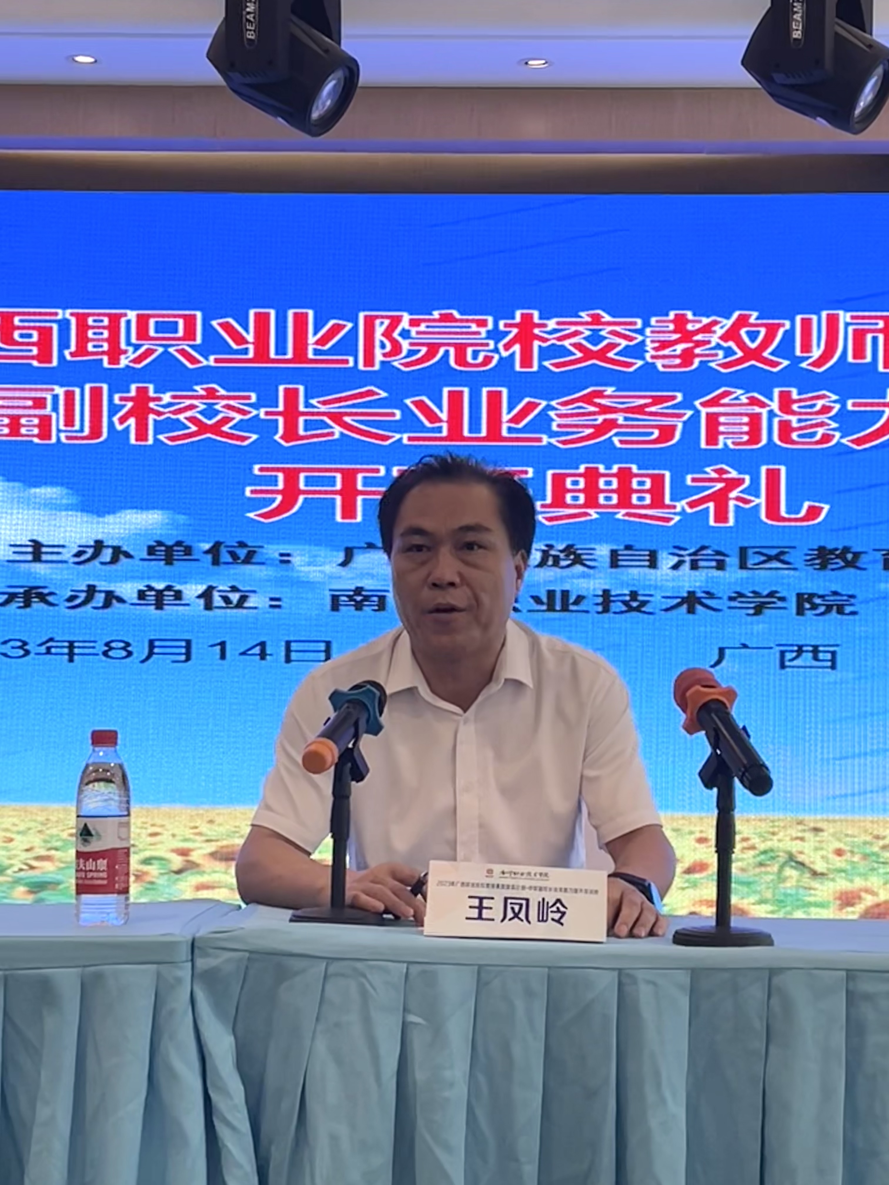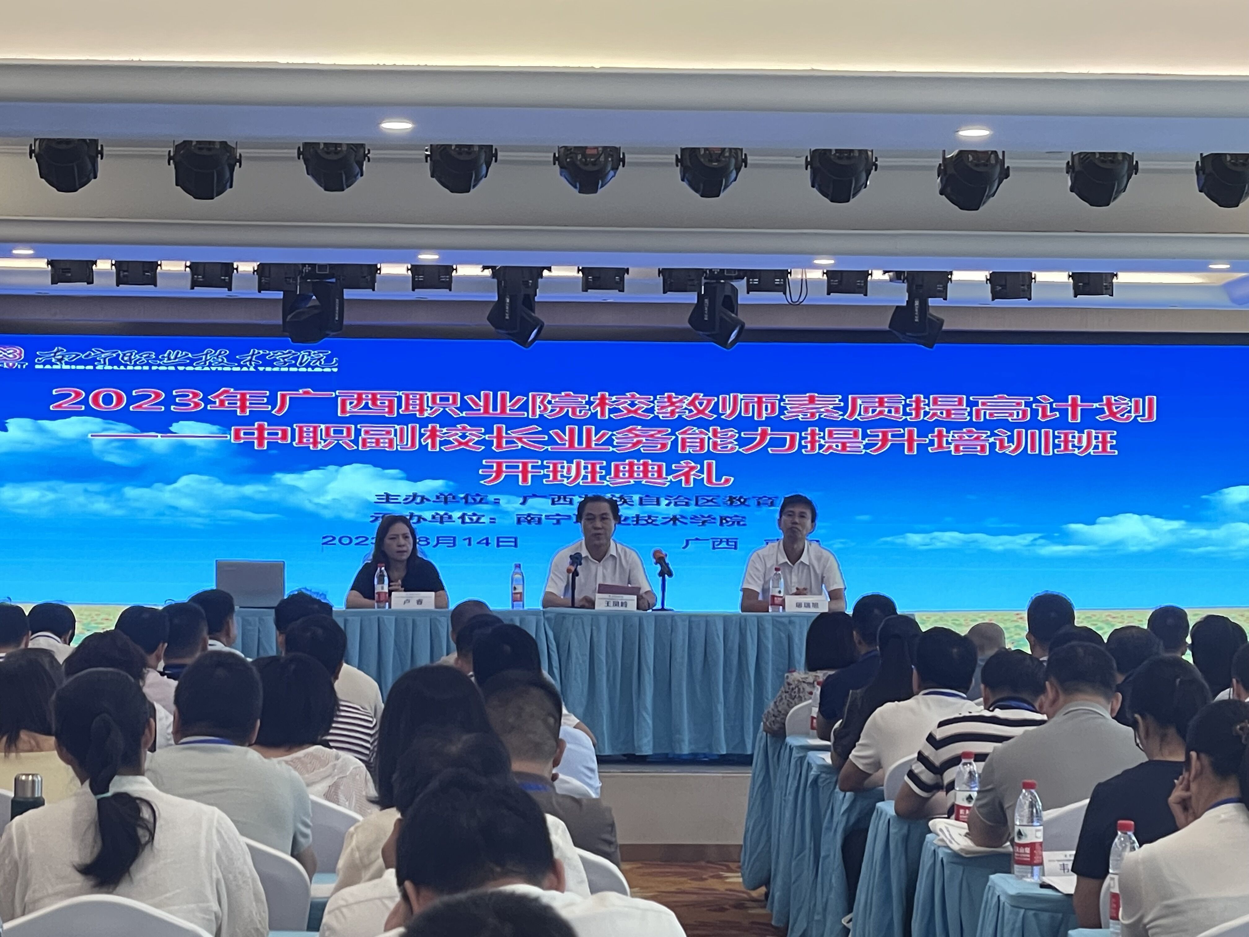 8月14日上午,由自治区教育厅主办,南宁职业技术学院承办的广西2023年职业院校教师素质提高计划--中职副校长业务能力提升培训班顺利开班。学校副校长王凤岭,健康与旅游学院党委书记、院长屠瑞旭,副院长卢睿以及全体学员参加了开班典礼。开班典礼由屠瑞旭主持。