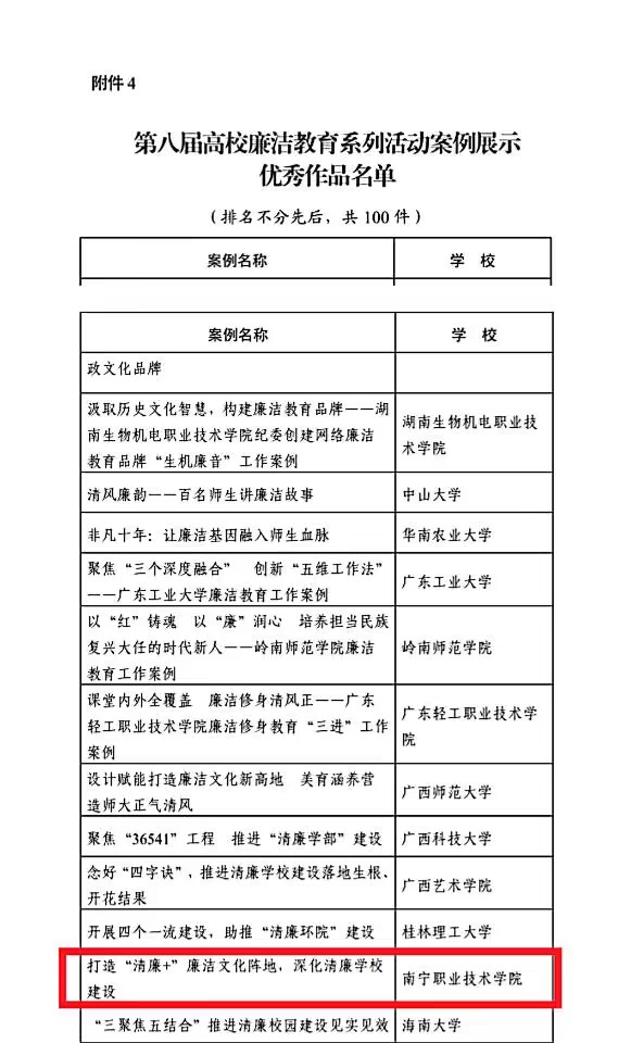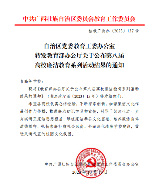 近日,教育部第八届高校廉洁教育系列活动结果公布,必赢官网案例作品《打造“清廉+”廉洁文化阵地,深化清廉学校建设》入选教育部第八届高校廉洁教育系列活动案例展示优秀作品,作品将在新华网、全国高校思想政治工作网、中国大学生在线、中国教育发布等平台进行展播。这次获奖是必赢官网被认定为广西首批清廉学校建设示范校后,在清廉学校建设方面取得的又一重要成果。