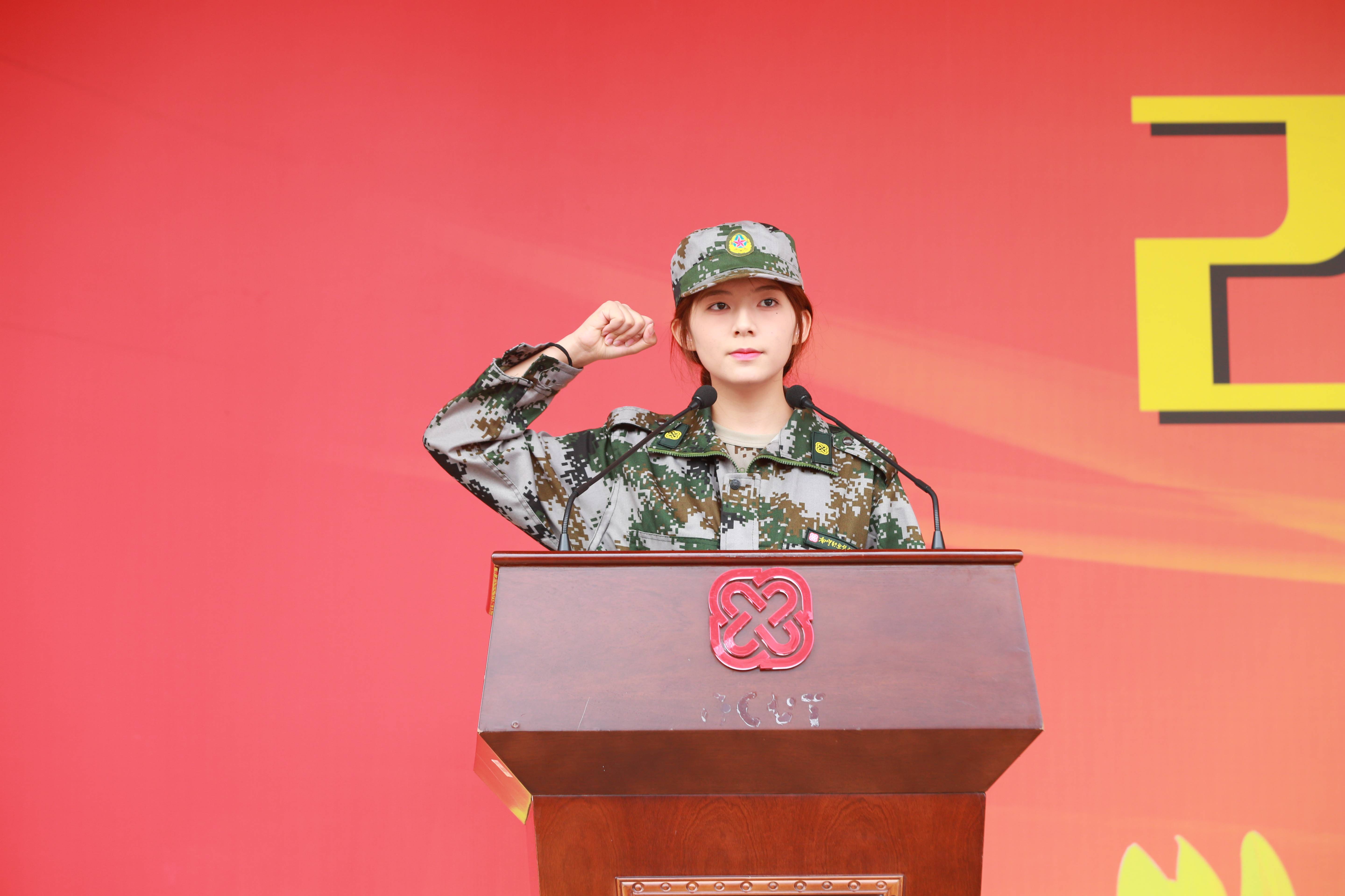 传媒学院新闻1班樊欣雅代表参训学生在会上发言及领誓。她表示,在军训过程中将严明纪律、听从指挥、服从命令、刻苦训练,努力传承军人爱国奉献、吃苦耐劳的精神,用良好的精神面貌展现南职学生的时代风采。