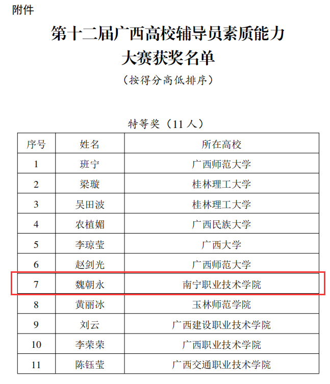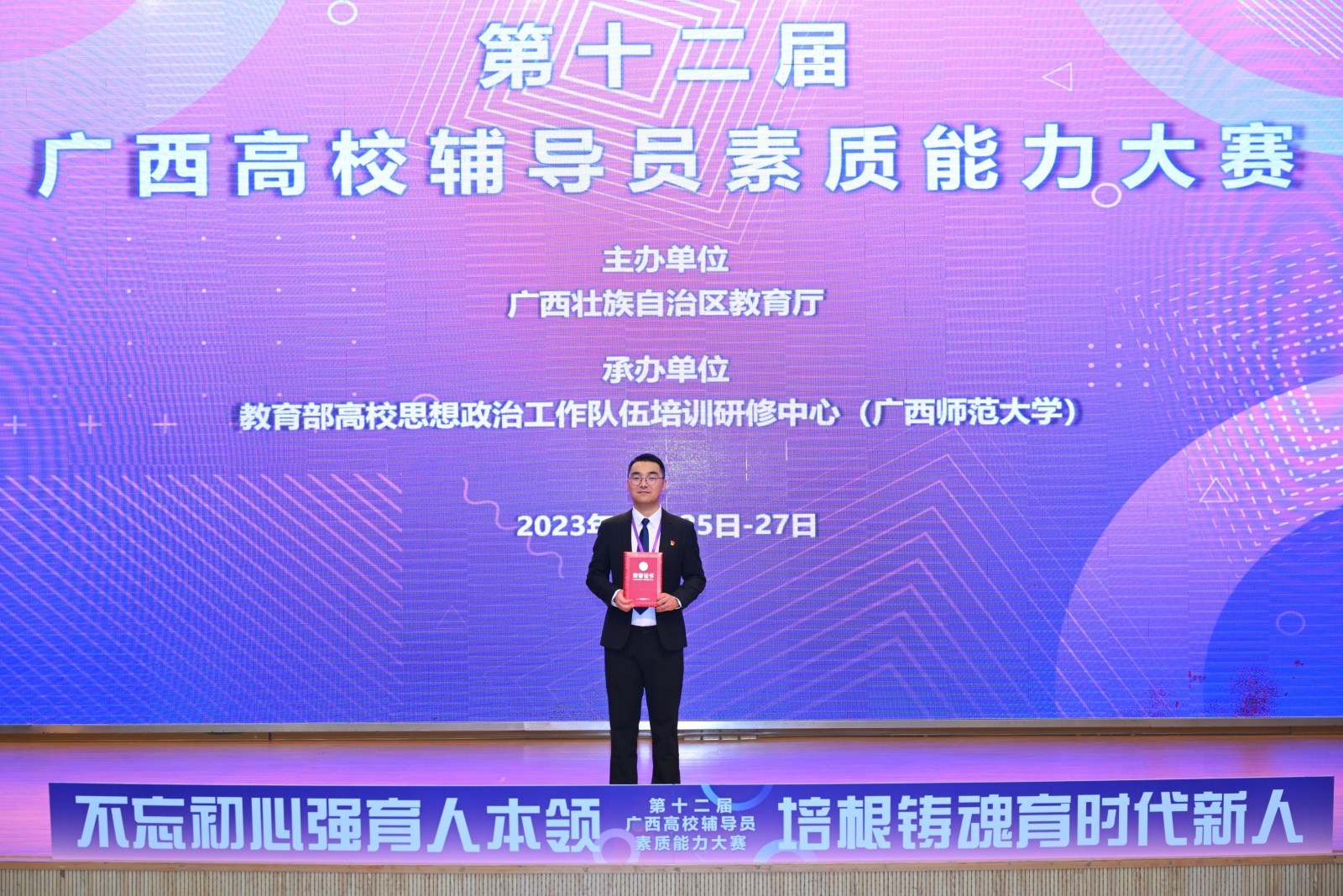 近日,由广西壮族自治区教育厅主办,教育部高校思想政治队伍研修培训中心(广西师范大学)承办的第十二届广西高校辅导员素质能力大赛在桂林举行。必赢官网健康与旅游学院辅导员魏朝永以过硬的专业水平,展现出新时代辅导员风采,从全区各高校92位参赛选手中脱颖而出,荣获大赛特等奖,高职院校排名第一。
