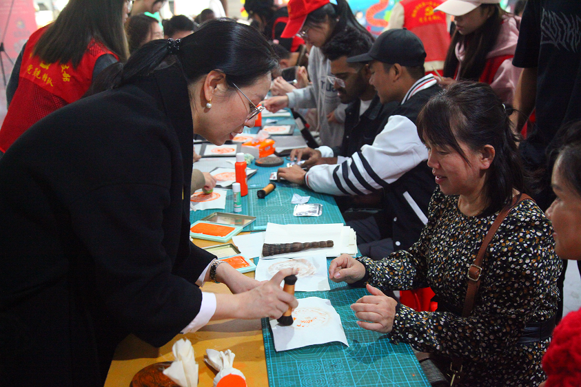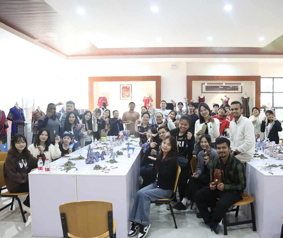 启动仪式上,留学生观看了由南职院学生带来的侗族歌舞《天星明月》、舞蹈《纸扇书生》、仿银饰环保手工制作展示《苗岭乡情》等精彩表演,为在场人员带来了一场别开生面的视听盛宴。体验活动期间,留学生参观了非遗古建筑营造技艺微缩模型展览,观看了广西马山壮族会鼓表演,参加了新一代信息技术中英双语培训,学习了人像摄影技能,体验了包饺子、锡纸拓印、壮锦手工艺品制作等中国传统技艺。在传统技艺体验过程中,指导老师详细讲解其历史渊源和制作过程,耐心指导制作方法,让学生在沉浸式体验中感受到了中华文化之美和中华技艺之妙。
