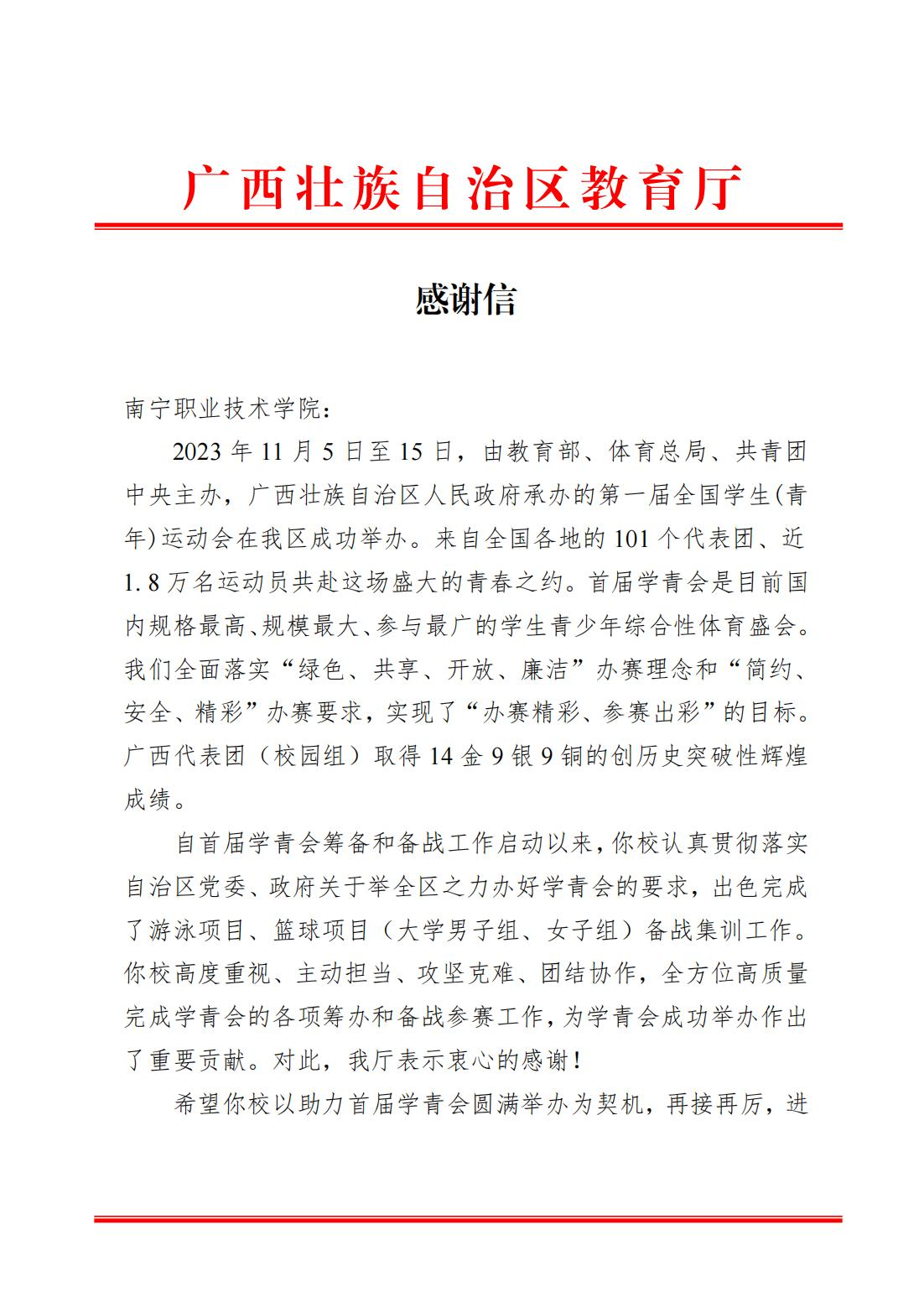 近日,自治区教育厅向必赢官网发来感谢信,感谢必赢官网为第一届全国学生(青年)运动会(简称“学青会”)的成功举办和各项目备战参赛工作作出重要贡献。