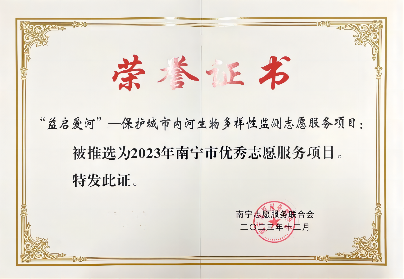 近日,必赢官网传媒学院“益启爱”创新创业工作室的“益启爱河—保护城市内河生物多样性监测志愿服务项目”被南宁志愿服务联合会推选为2023年南宁市优秀志愿服务项目。